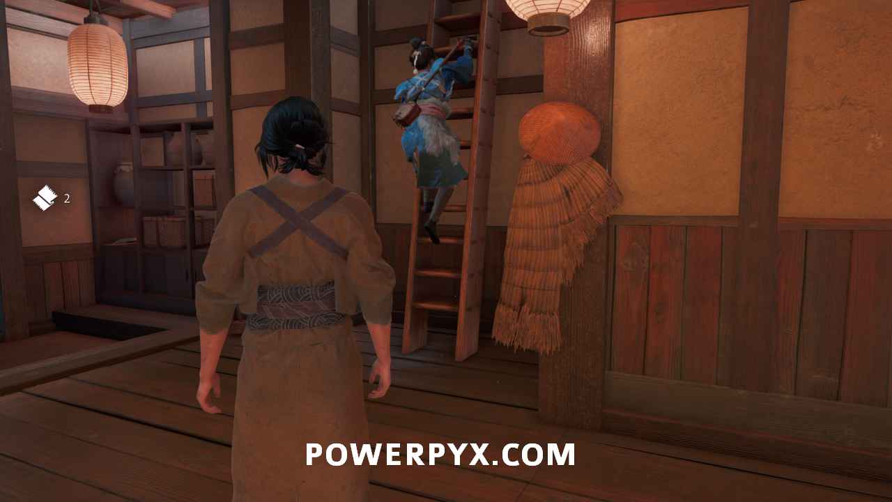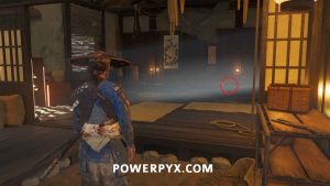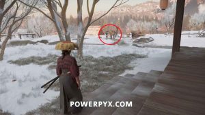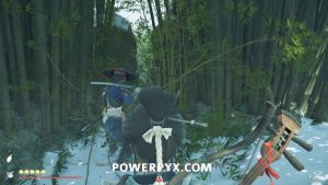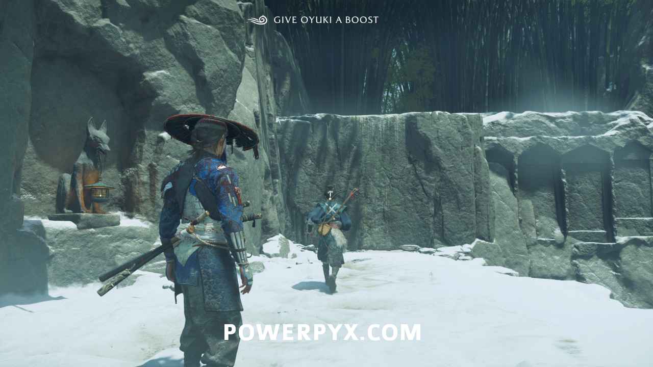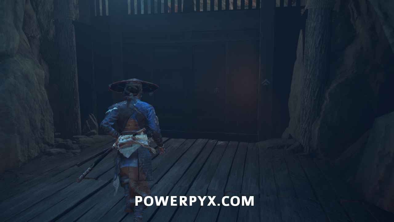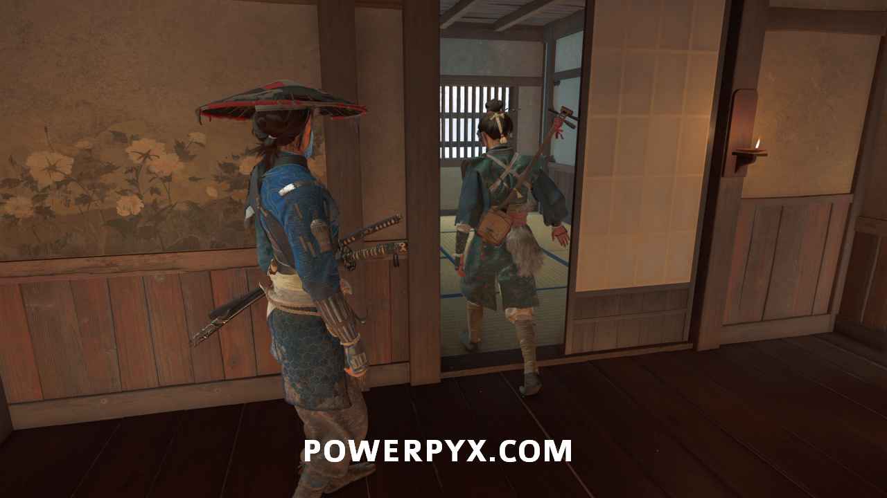 Interact with the bamboo wall. Then, yank it down with Oyuki’s help. Head inside.
