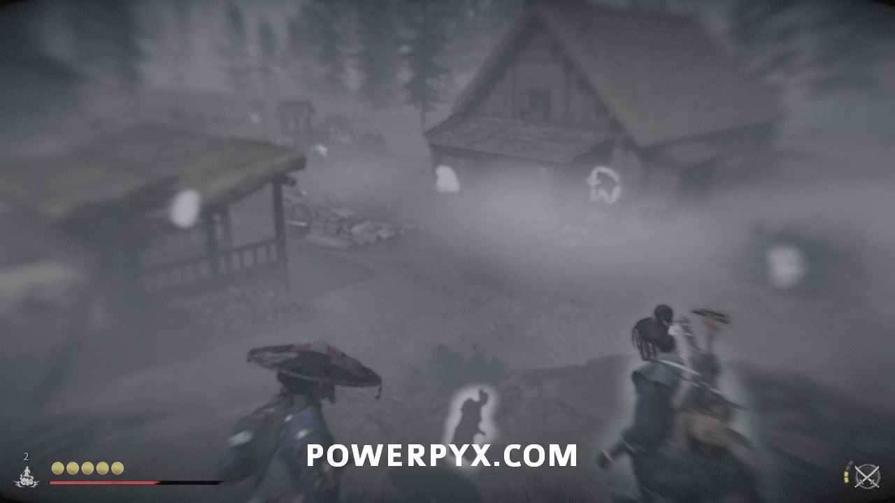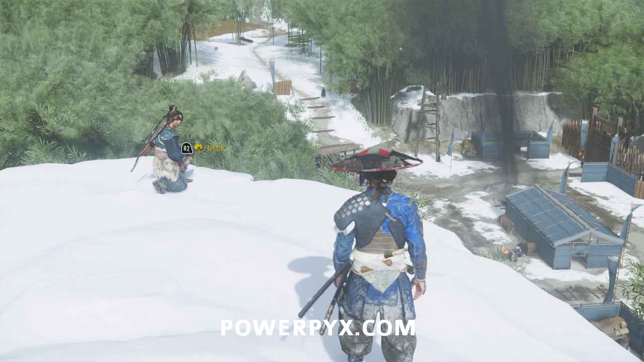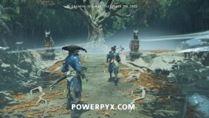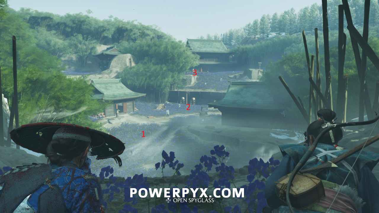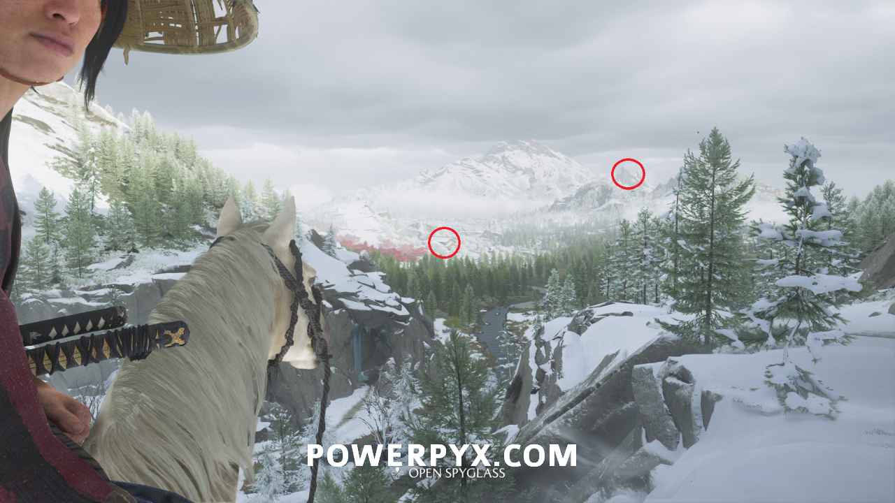 Use your spyglass and interact with the two spots in front of you using R2. To save some time later, interact with the mountain spot on the right to make available the Sensei Tale “The Way of the Kusarigama“.
