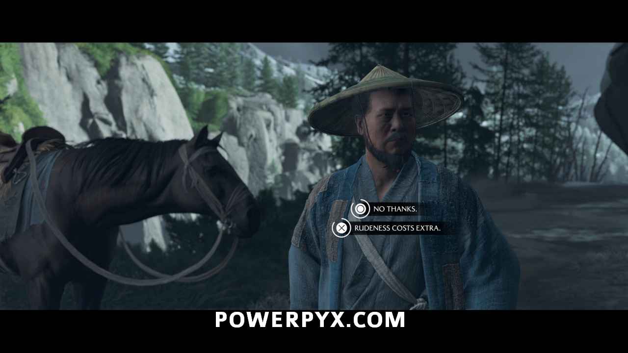 Head outside with Oyuki and get on your horse. This prompts a dialogue choice. Choose whichever one you like.