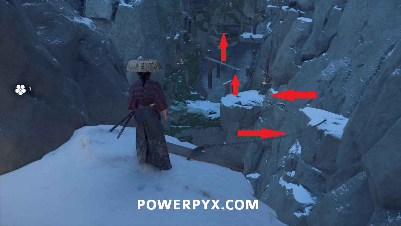 At the top of the rocks, swing across the fallen bridge using the grappling point.