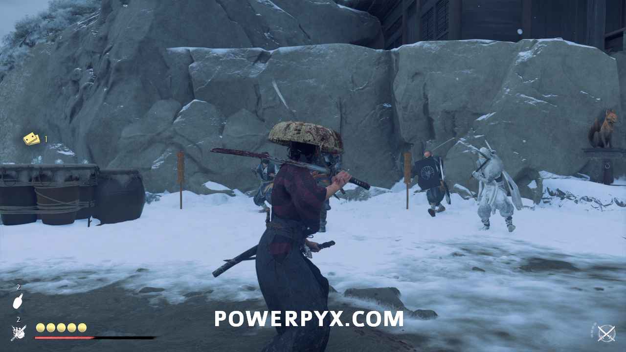 The second phase starts when the Kitsune throws a smoke bomb. Use R3 to identify where he comes from. Now, he uses a sword and shield. Break the shield with