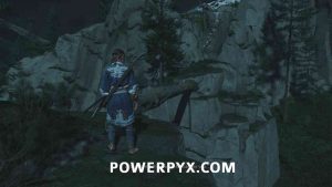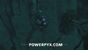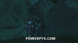 Here, turn right and go down a little slope, then swing over to the other side of the cliff and climb up there.