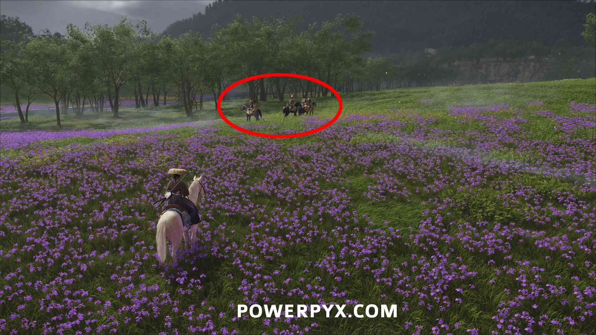 - Ride between your Home and The Old Inn/Yotei’s Shadow Inn, check for any enemies on horses or any groups of bounty hunters who interrogate civilians. These frequently spawn around Yotei Grasslands. Kill any such group and the last enemy will give you the info.
