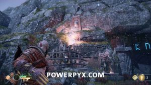 From the top of the wall you can jump over the pillars to the other side. There you see a huge dragon in the distance (screenshot #1 below). Go down the hill, ignoring the dragon for now. Defeat all enemies in the area. You’ll come to a door with 3 rune seals at the end of the path (screenshot #1 below). First, shoot the red tree sap on the right side with electric arrows to reveal the third rune. The other two runes are on the left (circled in red colors on the screenshot). The trick is to grab the red explosive ball from the vine on the right side. Throw it between the two runes on the left, as shown in screenshot #2 (it will stick to the wall). Have Atreus shoot the red sticky ball with electric arrows. Meanwhile, you throw your axe at the third rune on the right side. By hitting all 3 in quick succession the door will open.