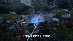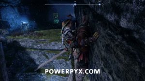 Follow the path on the left side all the way to the end. Halfway through you encounter some werewolves. A combo of your runic attacks and Atreus’ arrows will make quick work of them. Take note of the blue “crystal holder” next to the werewolves. At the end of the path there’s a stone ancient (screenshot #1). It won’t attack on its own but killing it may yield some resources for crafting the Ancient Armor Set. Continue up the path behind the Stone Ancient and push along the wall to the other side (screenshot #2).