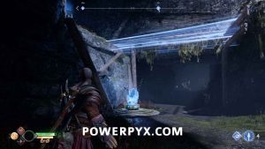 The hardest part is done. Return to the Stone Ancient and you’ll notice a green “orb” stuck in a stone (screenshot #1 below). The bridge of light you just created gives you enough time to carry that green orb over to the other side and put it in the next “orb holder”. Finally, put it in the door where the path ends (screenshot #2). You’ve done this a few times before in Helheim. The green orb can only be grabbed with the Blades of Chaos (