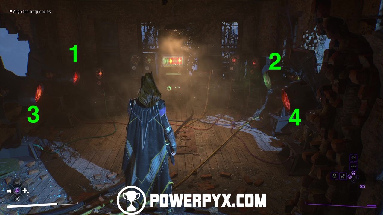 Now you need to align some frequencies. If you notice, around the tower are some amplifiers (not the ones looking outside) showing specific symbols. These amplifiers connect to the ones facing outside through colored wires. You have to follow each colored wire and set the corresponding symbol on the amplifiers looking outside. However, you must do this in a specific order. Facing the amplifiers looking outside, we’re going to number them 1-4, top to bottom, left to right. Interact with 2, 4, 1, 3.