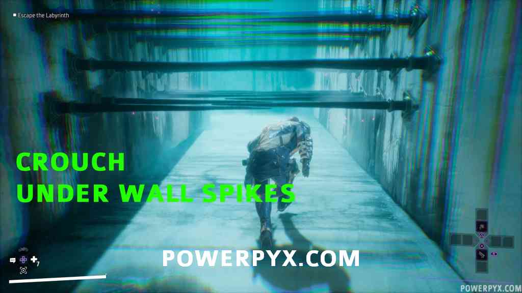 At the start of the labyrinth, always stay crouched. There are spikes on the side of walls that will come out when you are near them. If you stand they will hit you, but if you’re crouching they can’t hit you.