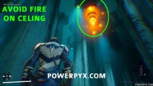 Advance until you come to a room with flamethrowers on the ceiling. Look up and walk on the path where the flamethrowers are inactive.