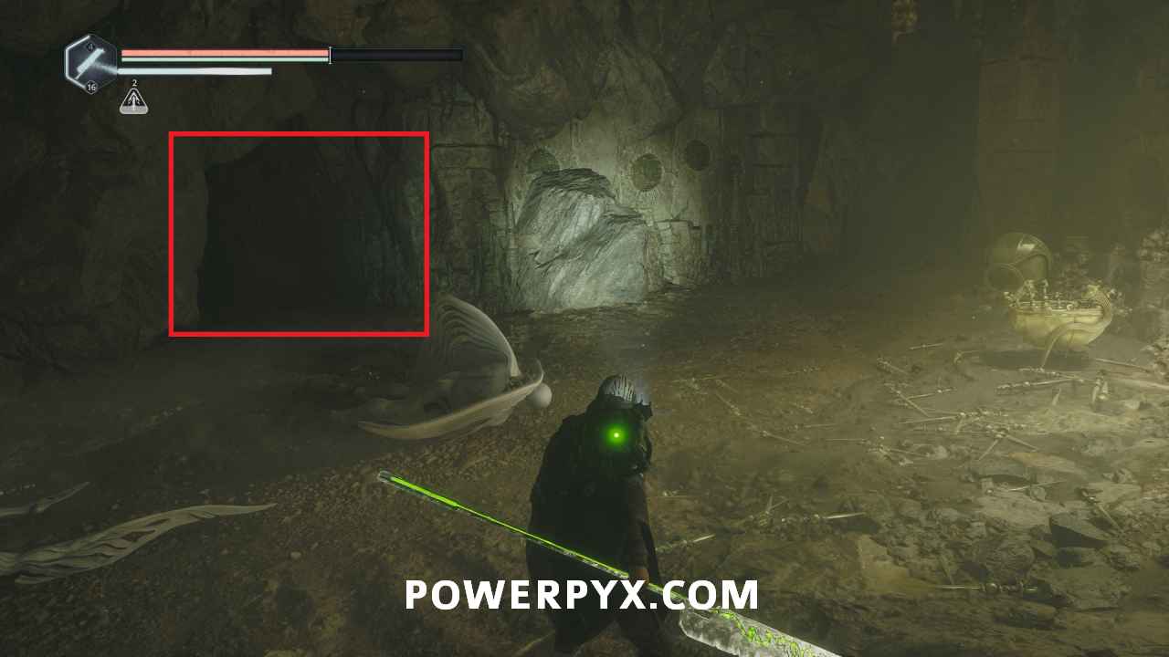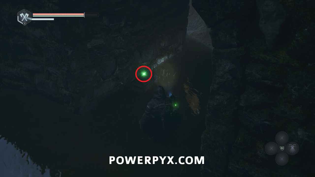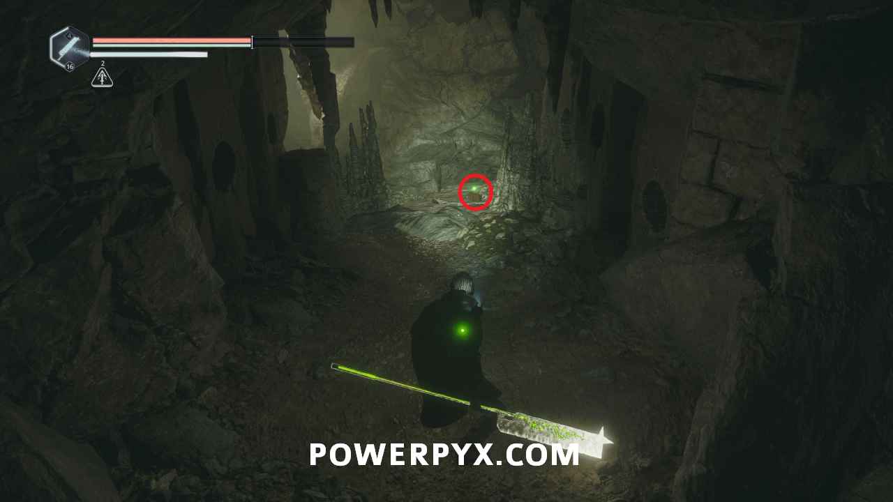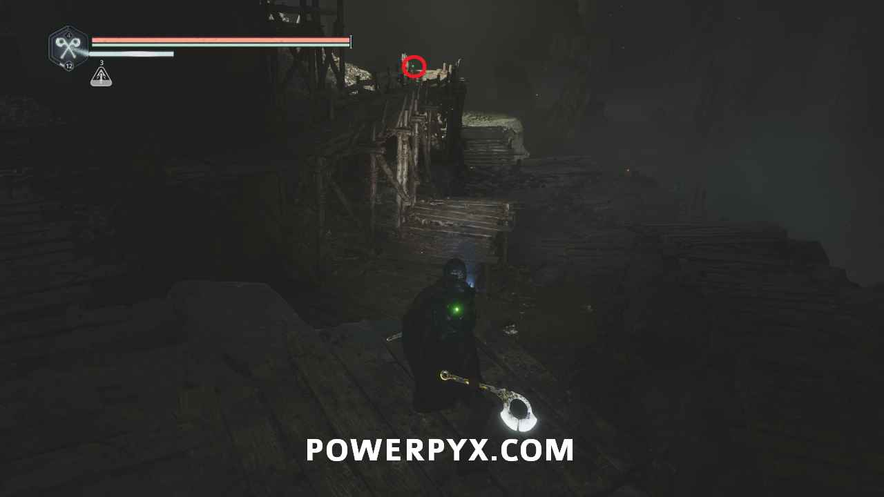 Follow the main path until you reach the third save point on the wooden scaffolding, then keep following the path down to the lowest level. When you reach the first platform with a ranged enemy above you can follow the path around to the right onto the platform, then to the end where there is a ranged enemy on top of this glyph.