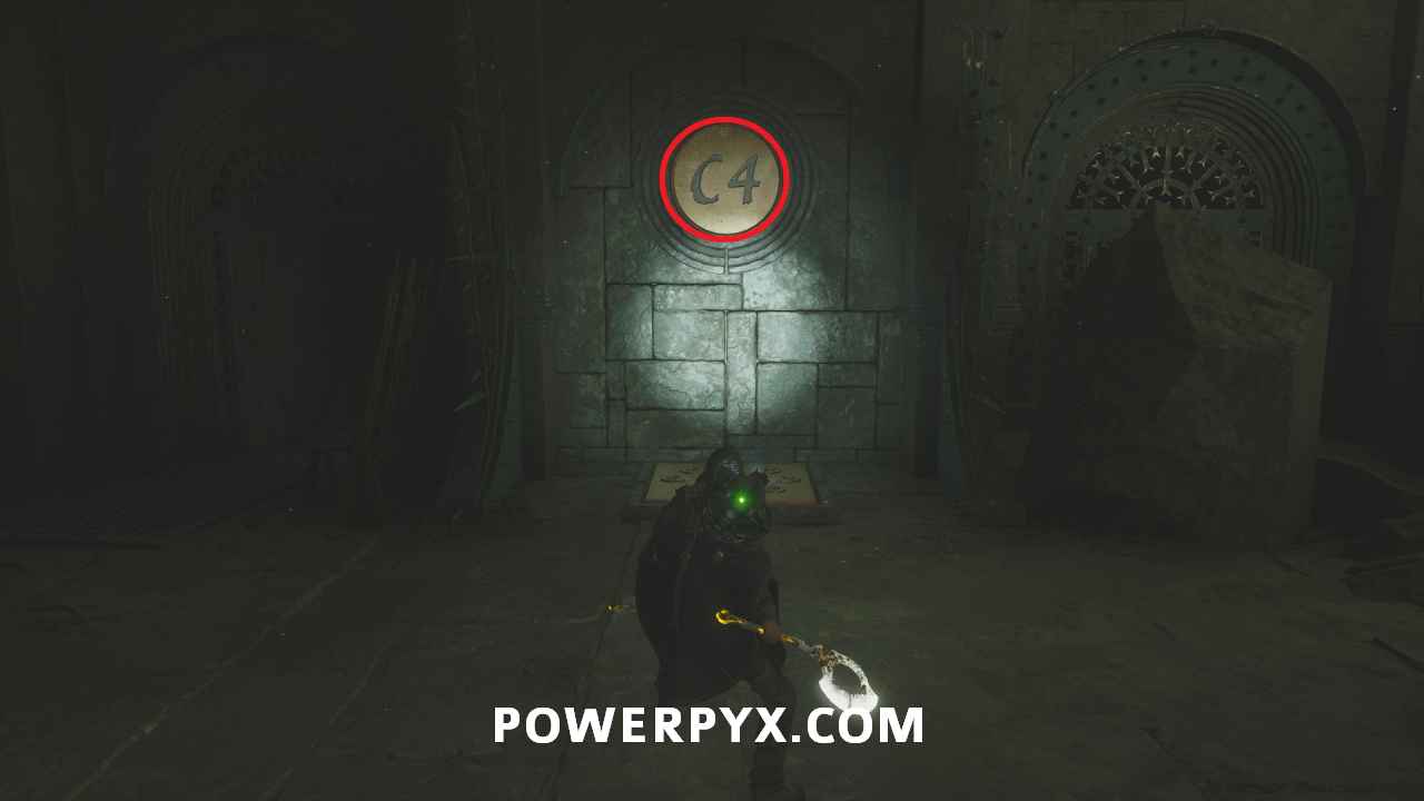 Go up the stairs and up the set on the right to the next level, then go through the cells on the left to reach the C section. Step on plate C4 then run back down (you might have to drop through the hole in the floor to reach it in time) and pull the Eye lever to open the door on the right of the room. Inside you can pick this up on the left.