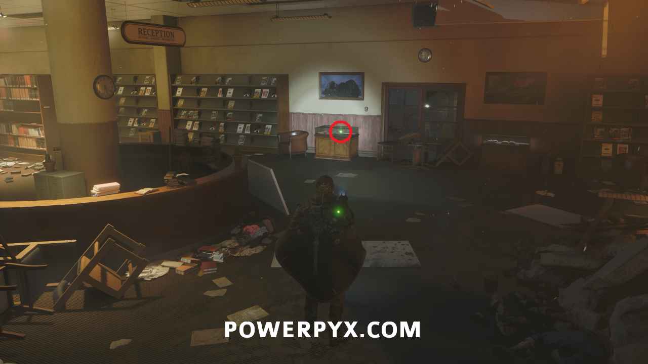 Follow the main path upstairs to the computer room, then drop down the hole to the library. To the right of the reception desk, you can pick this glyph up from the glass case with the firearms.