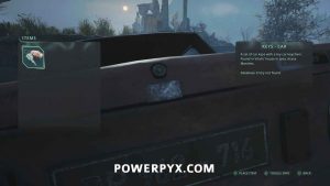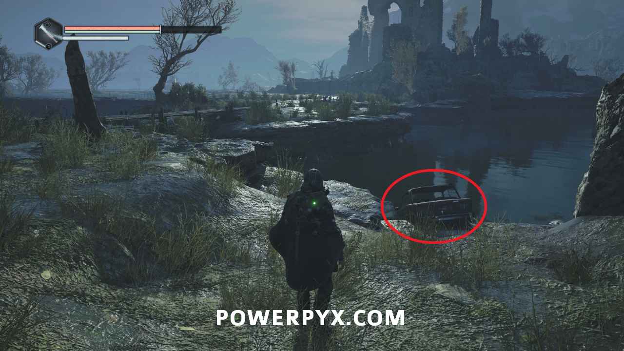 Go back out the east side of town toward the tree with the hanging bodies, then north to the ruins where there is a car sitting in the water. Interact with it and use the Keys – Car to open to trunk to receive Recording – Vitalis’ Departure, Necklace, Lymbic Twin Axes, Glyph: Chromatic Shielding, and Limbic Imbuing.