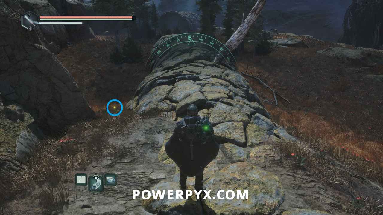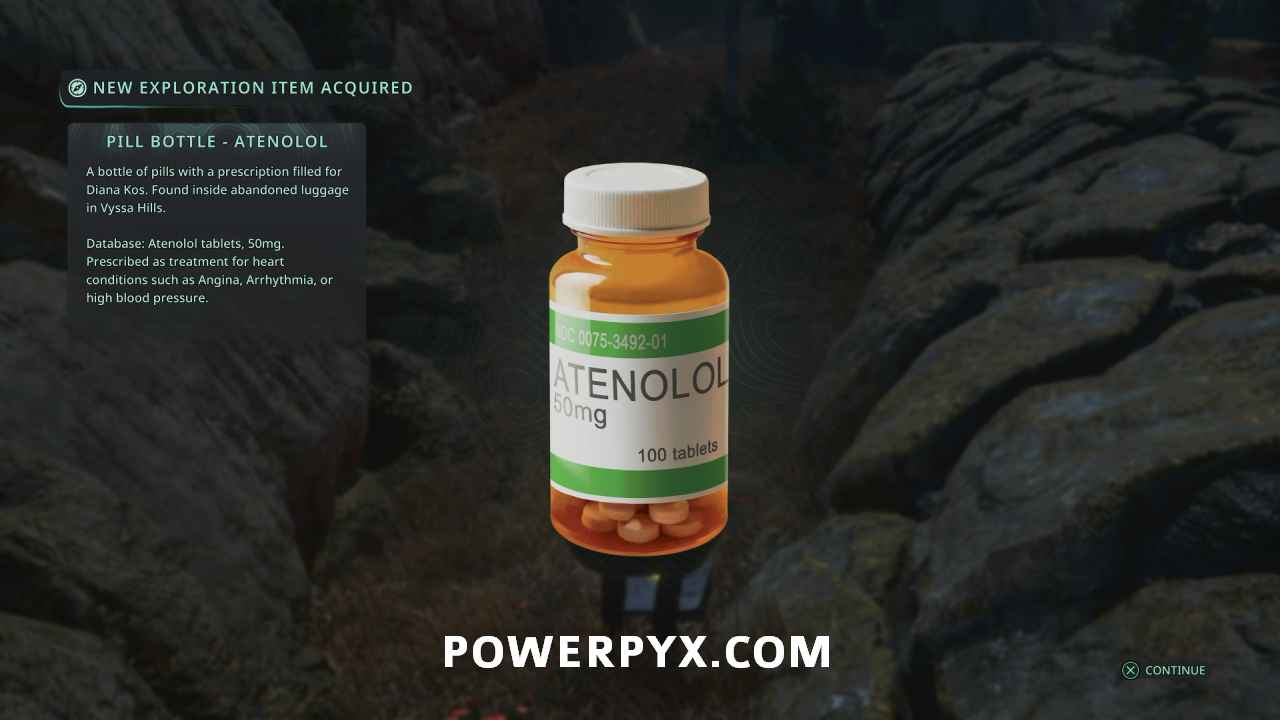 From Vitalis’ grave go left up the small hill (far north of the area if you are coming from the APC) and look on the opposite side of the pile of rocks to find a pickup for Pill Bottle – Atenolol, starting this good deed.