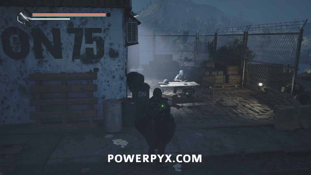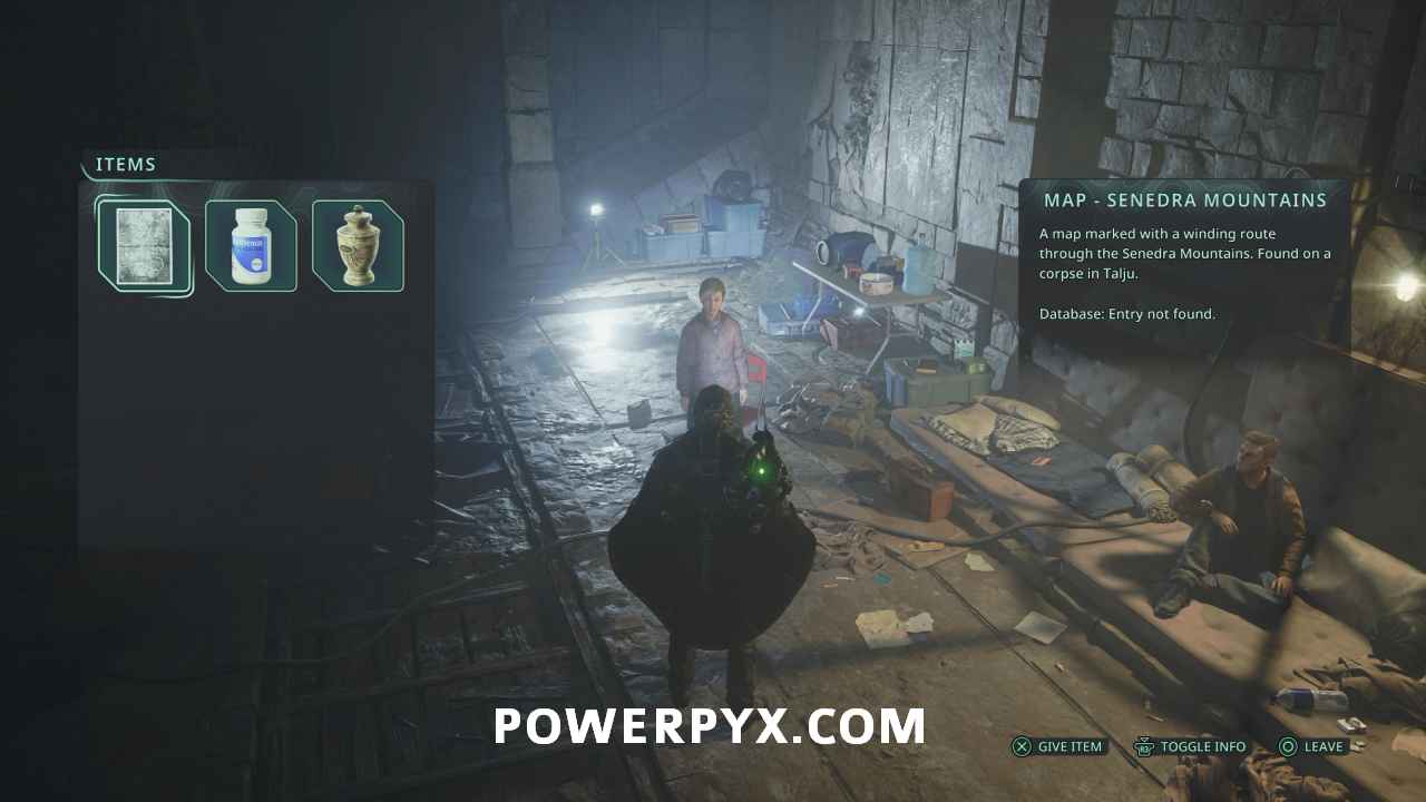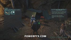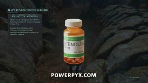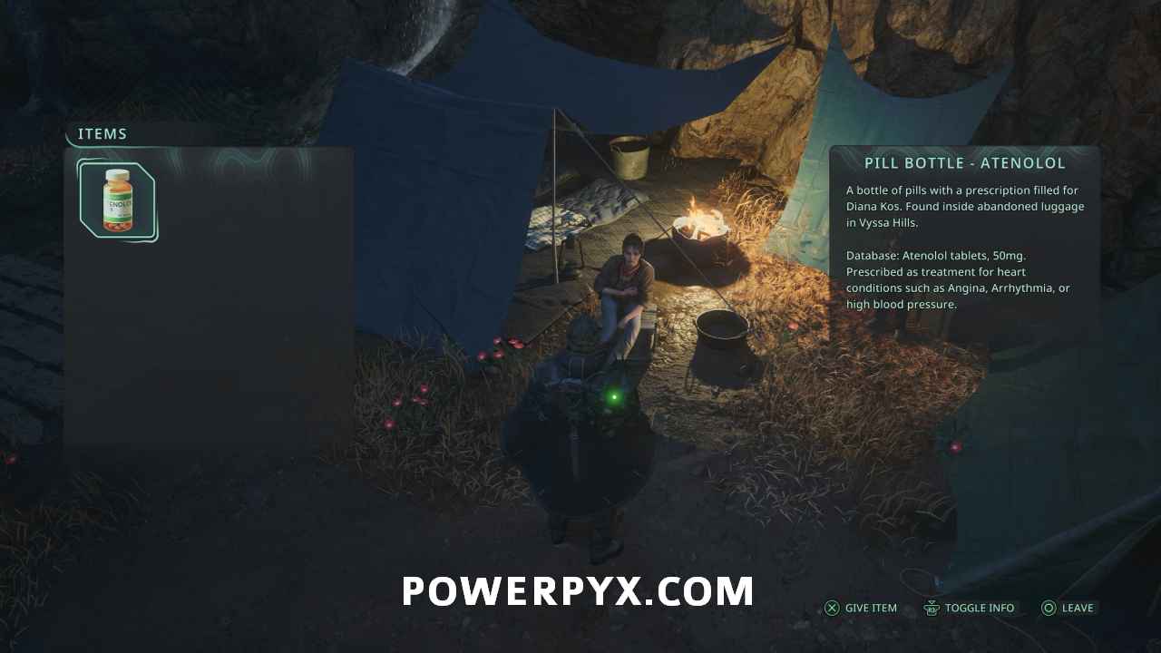 Go toward the Timeloop location and then go down the path to the northwest. Climb the ladder to reach a camp area. Go to the woman on the left and trade her the Pill Bottle – Atenolol to complete this good deed.