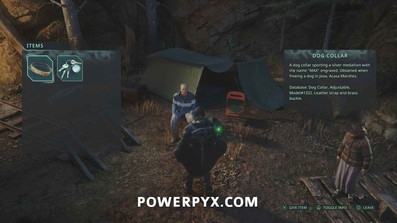 Travel to Vyssa Hills and from where you enter with the APC follow the path north all the way to the camp with the refugees you interacted with the first time you were in the area. Speak with the man on the right and trade him the Dog Collar to complete this good deed.