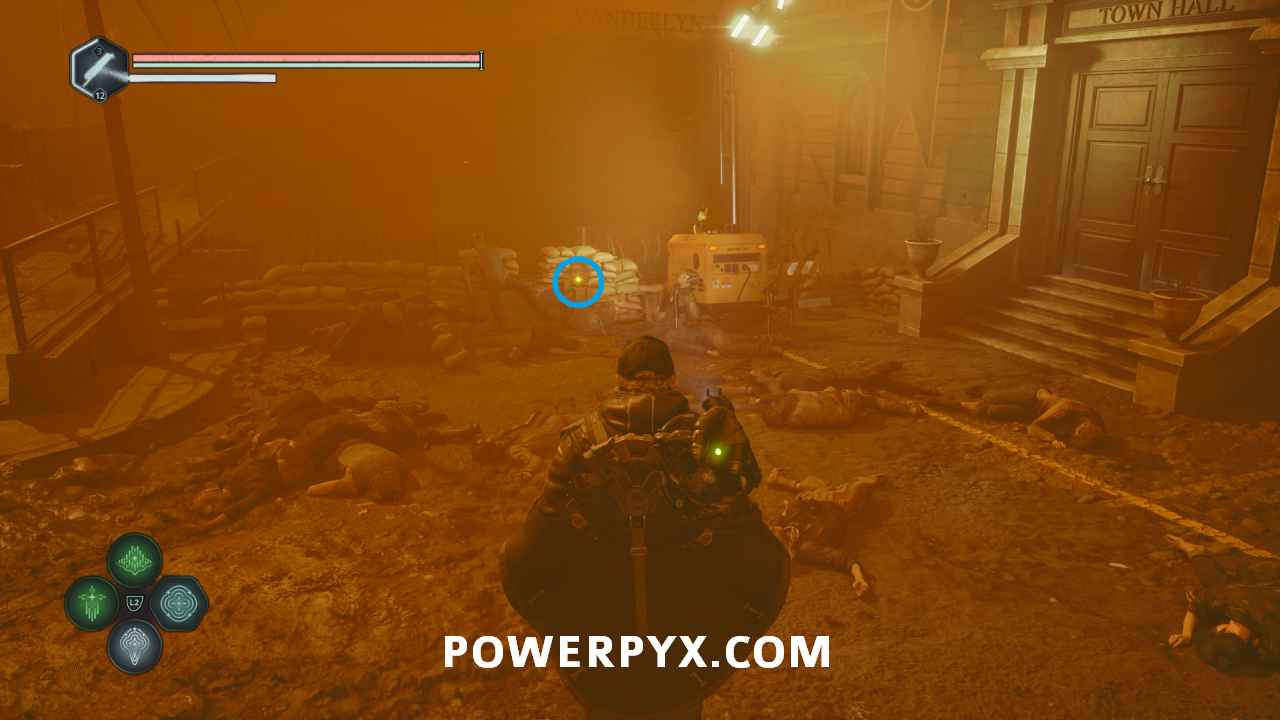 This good deed is in 4 parts, and is what you need to finish in this area before continuing the story events. Go back to the APC and then make your way to the Town Hall (labelled 1 on the map). Out front by the door you can pick up 4 x Signal Flare. You are going to be giving these to people around the town to rescue them.