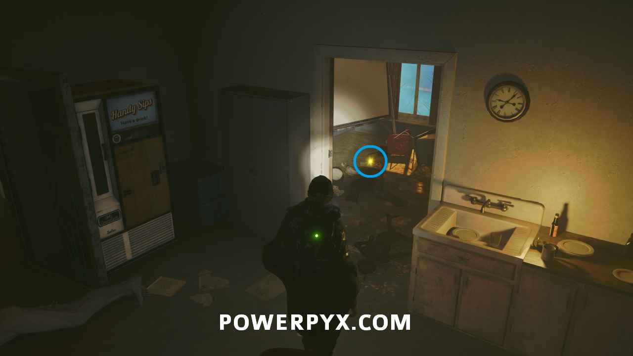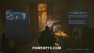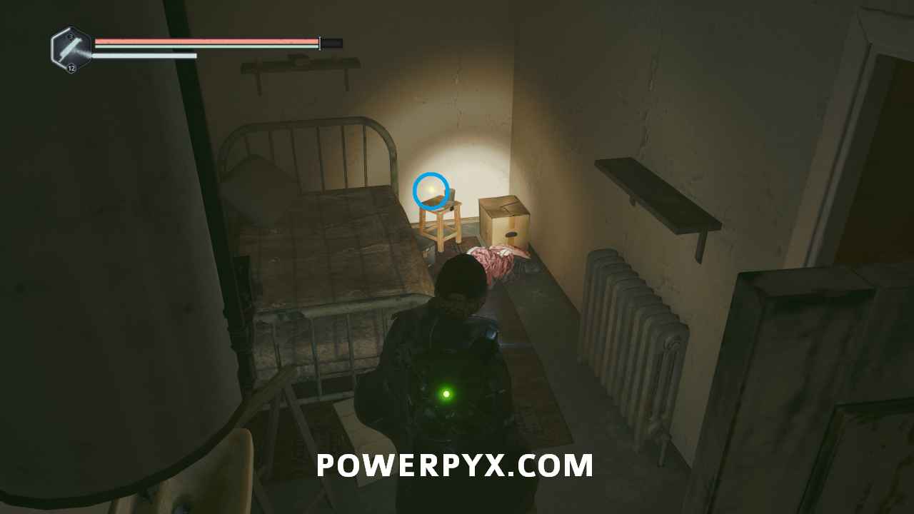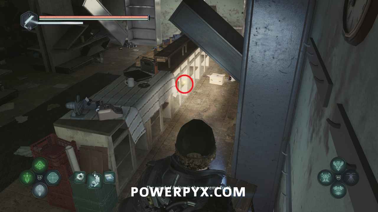 Follow the main path upstairs and at the split in the path after the room with the hanging man go left toward the painting of the king. Turn left and go into the room with the man at the desk. On the right is a door where you can use the Keycard – Ministry to open the door, then open the one leading into the hallway where you can pick up Satellite Radio.