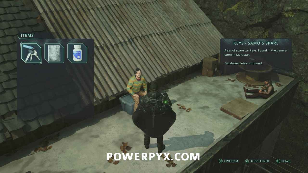 Go back out of the store and west on the lower level of the road to the end where you can reach Grisibel’s Auto Repair. Go around the back and climb the ladder to reach the roof where there are two people. Trade the man Key’s – Samo’s Spare to complete the good deed.