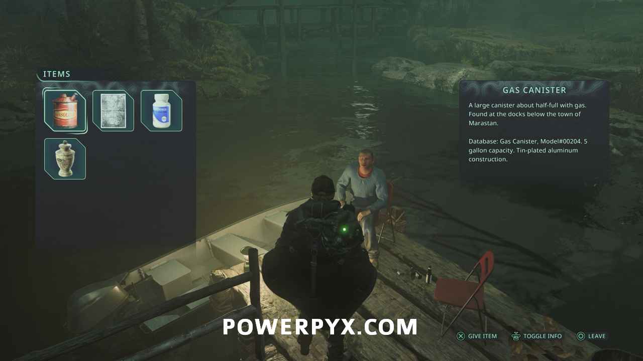 Go back to the APC from the nearby save point and then go to the blue house across the river to the right where there is now a man sitting at the dock. Trade him the Gas Canister to complete the good deed.