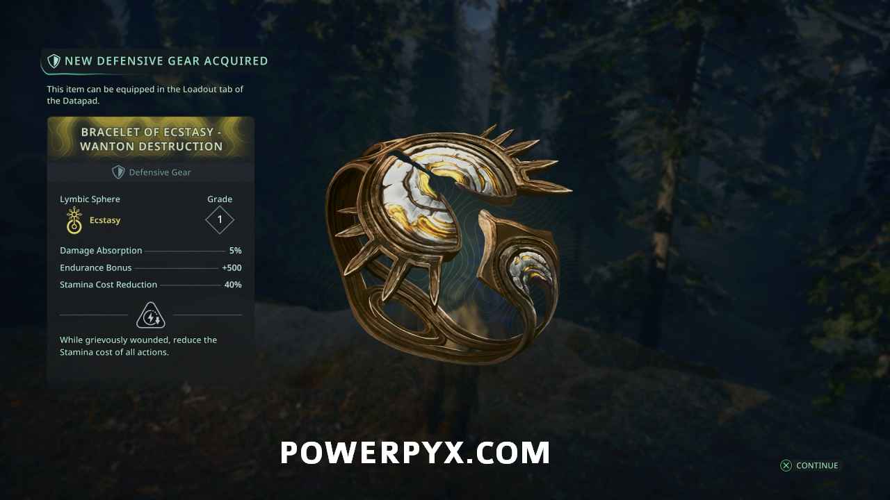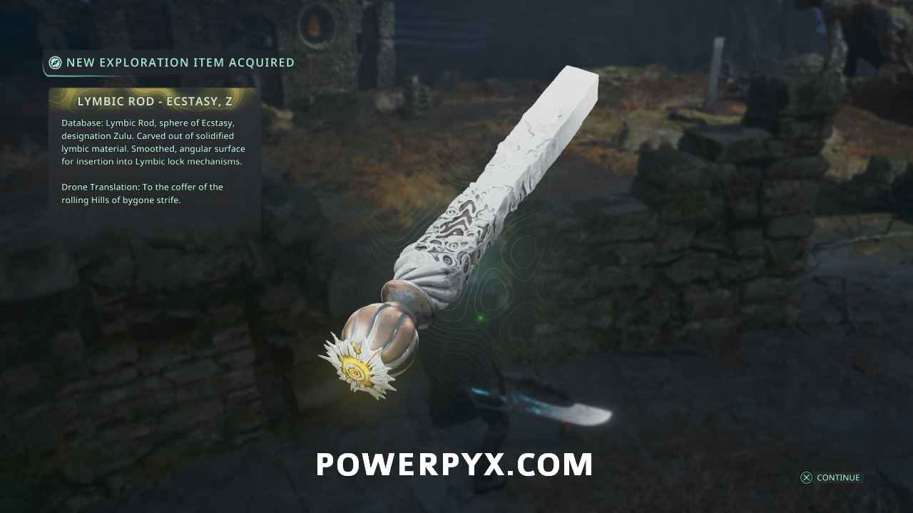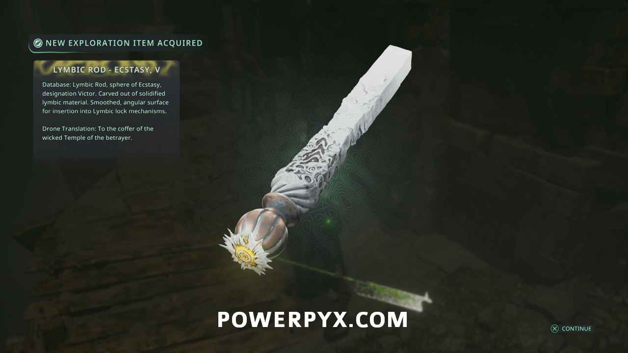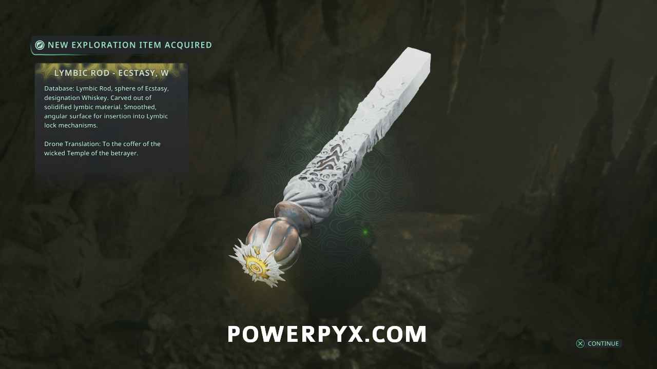 Back from above save point, this time take the path leading west, staying to the left. Defeat the enemies attached to the blue Haze in the room to clear a Timeloop Guardian, then continue up the path left behind where the ranged enemy was. At the end of the tunnel near a group of enemies you can pick up Lymbic Rod – Ecstasy, W.