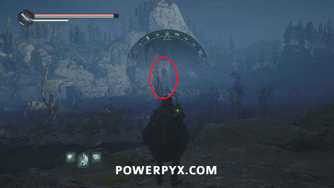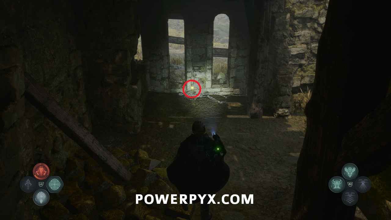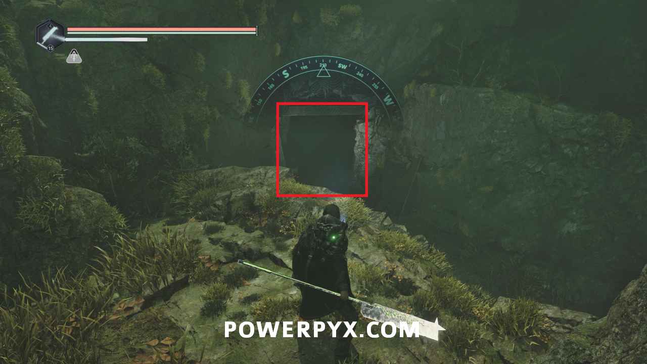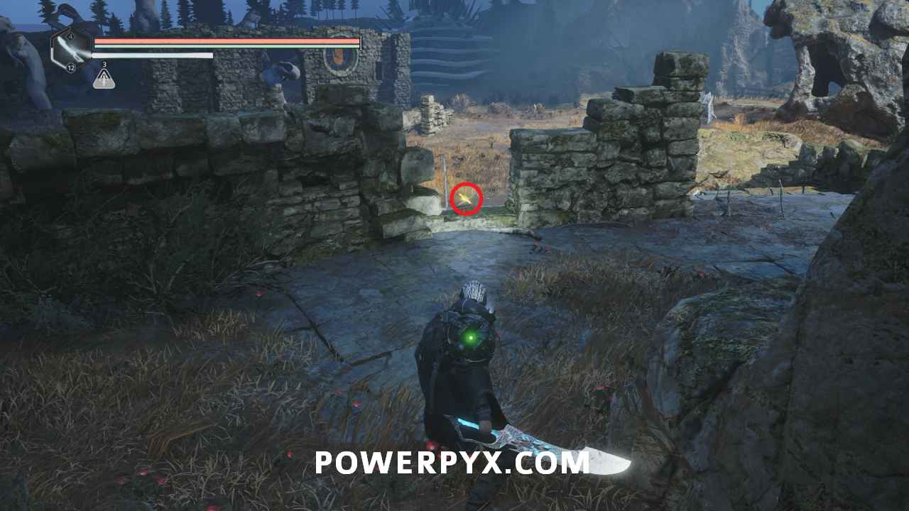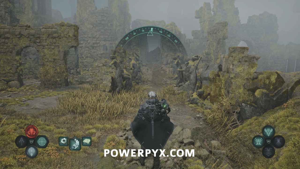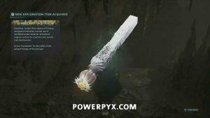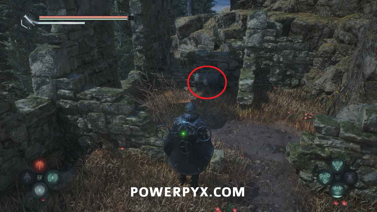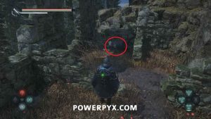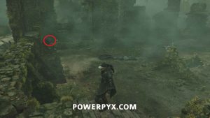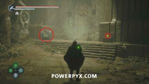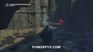 Go to the stairs at the top of the area, then northeast. Beside the spot with the hole in the floor is a pathway with stone Hollow statues. Past it you can enter a building with a chest, where you can use the Key – Mossy to receive Defensive Gear: Idol of Ecstasy – Battle Trance and complete this mystery.