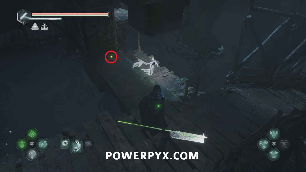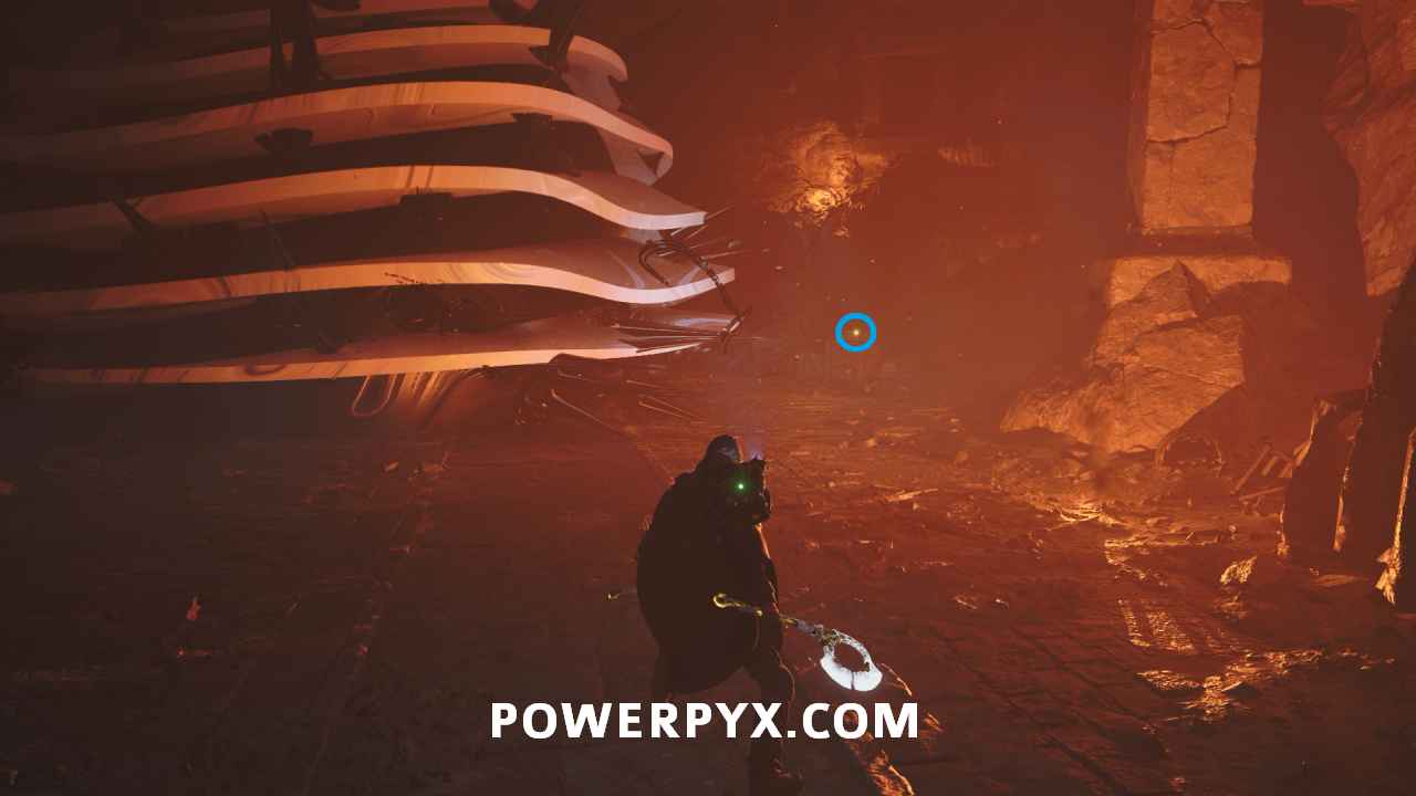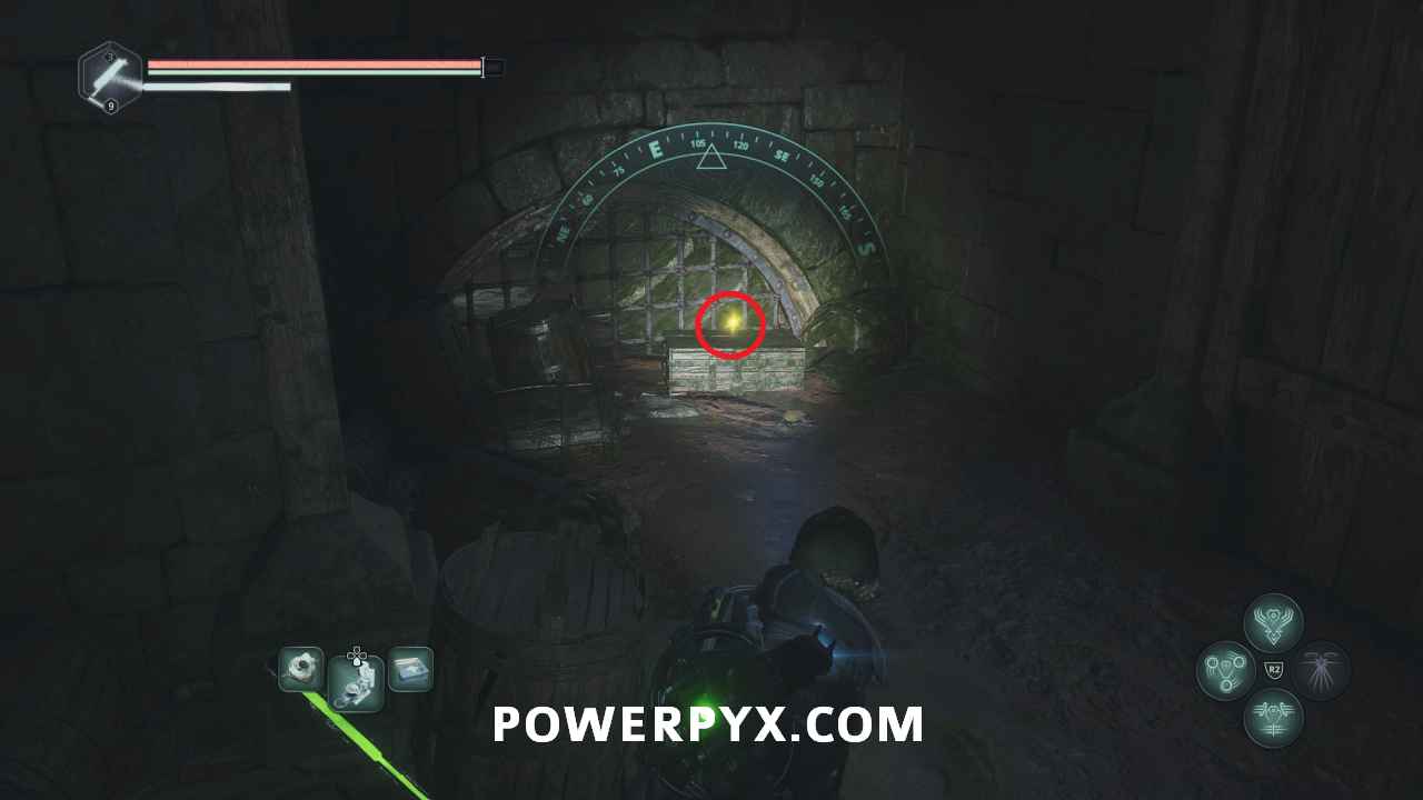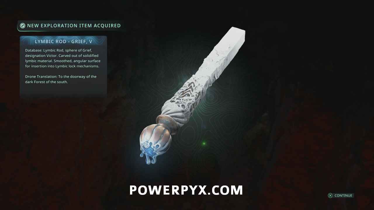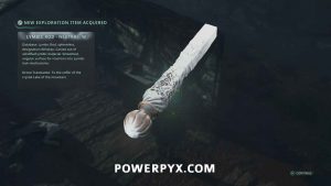 Follow this path into the next area where the red-lit structure. Past the enemies on the right you can pick up Lymbic Rod – Grief, V and Note – Cryptic Maxim.