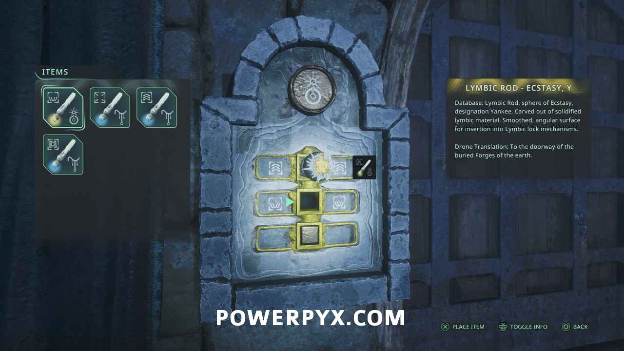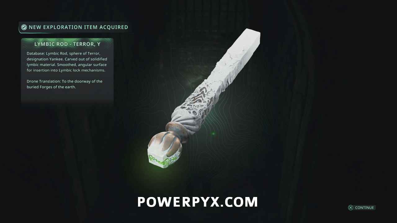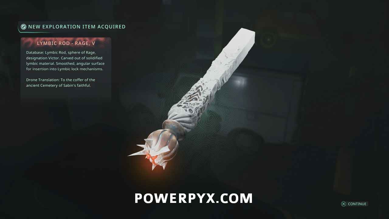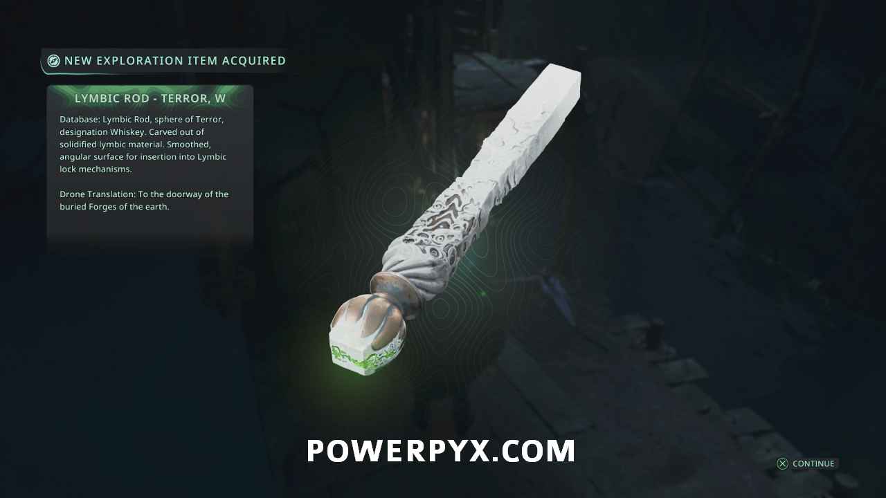 In the Lymbic Forge, go into the first area with the 4 interact points on the pillar before the first lever door. Go down the sides of the room down the stairs. Follow the path to the back where you can pick up Lymbic Rod – Terror, Y from a chest.