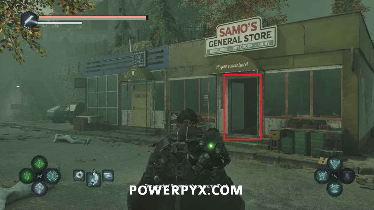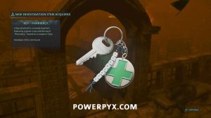 You first need to obtain the keys for the Pharmacy building. Go to the southwest corner of town where the playground is. Turn around from the swings and go up the stairs toward the big tree. On a body on the railing you can pick up Keys – Pharmacy.