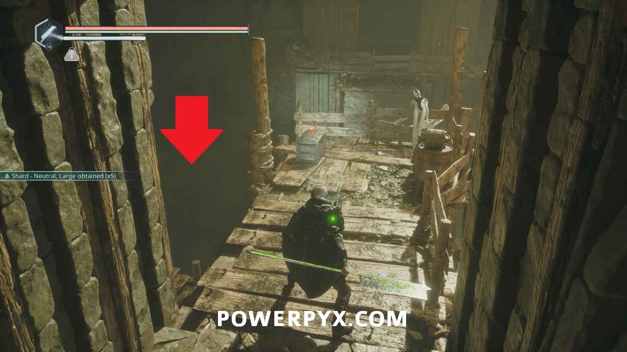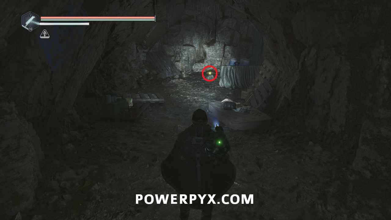 Follow the path to the lowest level and the scaffolding right before the elevator. Go up the ladder on the right and follow the path around the pillar, then down the cliff to the right past the enemy. At the end you can find a chest where you can use the Key – Rusted, completely the mystery and obtaining 5 x Tuning Stone – Steady.