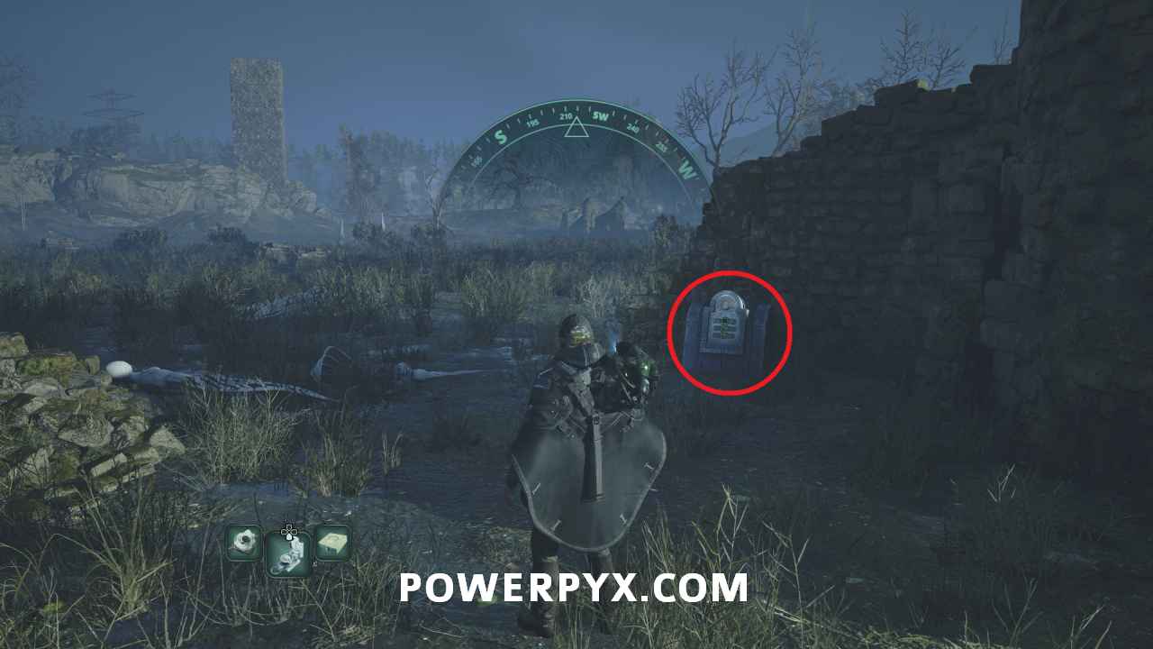 Travel back to the APC from the save point at the start of the catacombs. Go west and then south back past the barn, then toward the ruins on the left. Go around the back where there is a wooden bridge leading to a small island, with a tunnel at the back. Go through the tunnel then on the other side you are in the ruins. Go up the nearby stairs and drop into the open center of the ruins with the two enemies. In the southeast corner is another set of stairs that leads up the walls, which you can follow to a second set leading to the area where you can find the chest. Insert the Lymbic Rod – Terror, V to open the chest, completing the mystery and obtaining an Amine Prism – Theta.