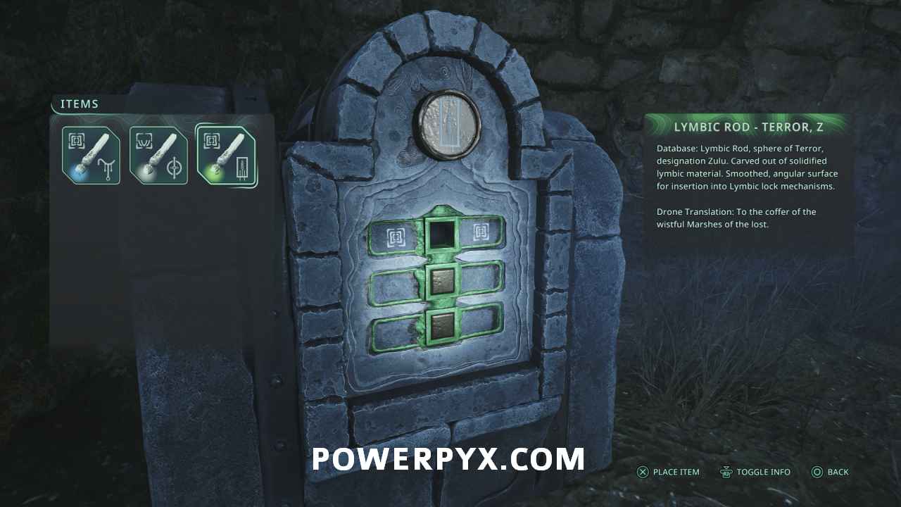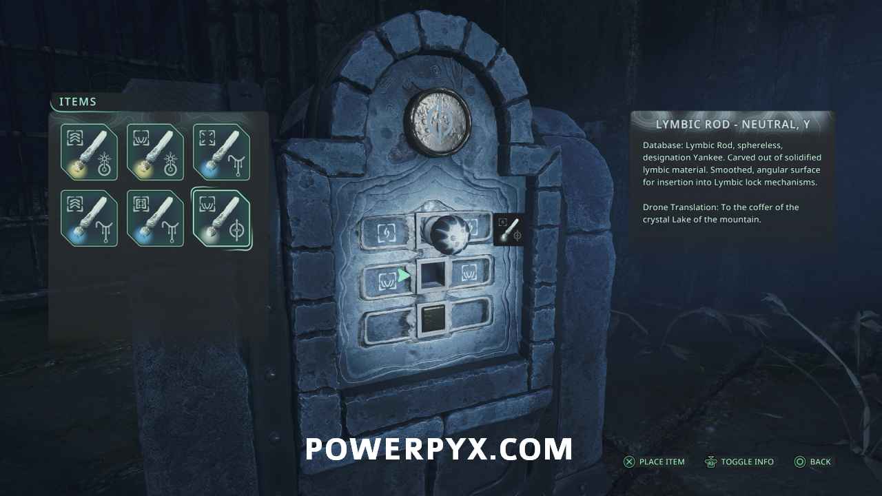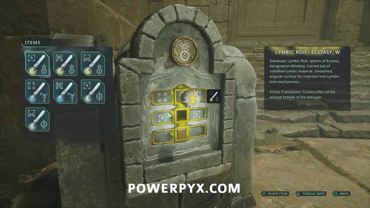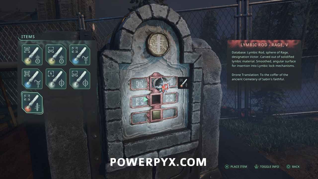 Go back to the room where you rotated the torches and through the door where you used the Owl key. In the room where the enemy was you can find the Lymbic Chest where you can insert the Lymbic Rod – Rage, W, obtaining Glyph #15: Nightfade from the chest and completing the mystery.