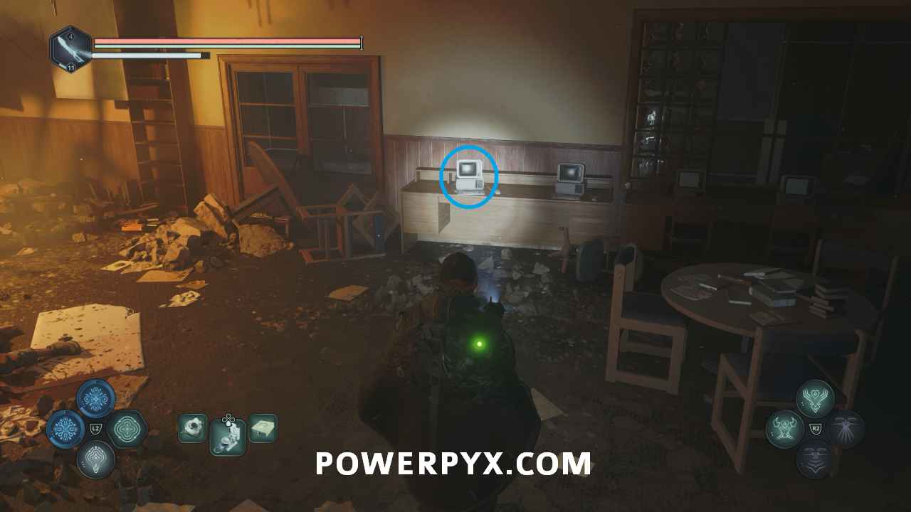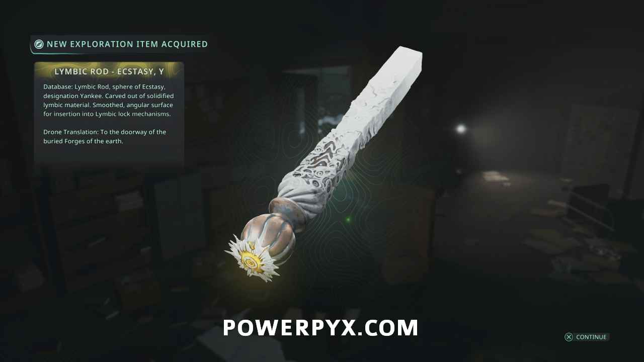 Follow the main path through the area until you drop down into the lower floor. Go through the office area, then on a desk near the doorway, you can pick up Lymbic Rod – Ecstasy, Y.