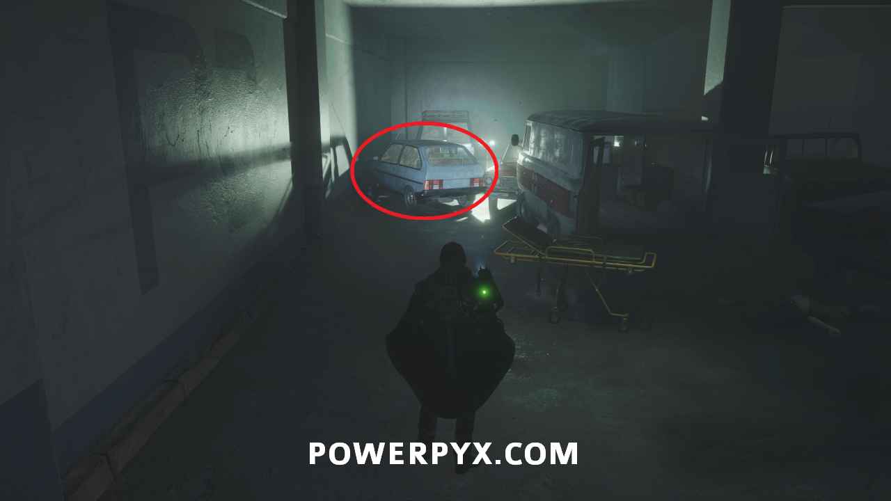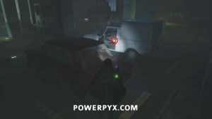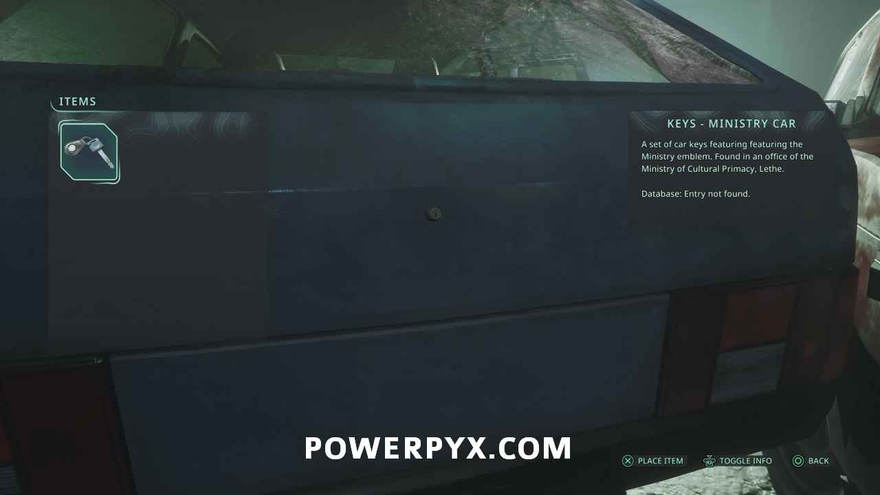 Make your way back to the parking garage and to the lower level. On the left of the ambulance with the open back you can find a light blue car. Interact with it and use Keys – Ministry Car to open it and receive Lymbic Rod – Ecstasy, X and Report – Confiscation.