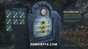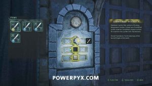 Keep going back through the ruins until you reach the door with the circles on either side. Place the medallions so the ram heads face each other to open the door and complete the mystery. In the room you can pick up Glyph: Recoil and Journal – Queen’s Decree.