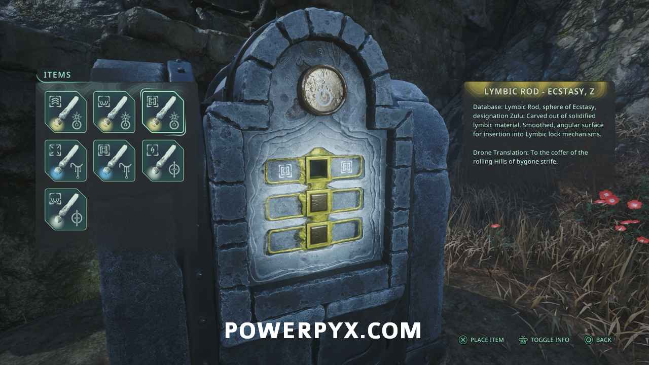 Continue on the main path past the second pressure plate room, then down the area where you defeated a bunch of enemies. In the next room on the left you can find the yellow Lymbic Chest. Insert Lymbic Rods Ecstasy, V and Ecstasy, W to open the chest, awarding 5 x Tuning Stone – Strong and completing the mystery.