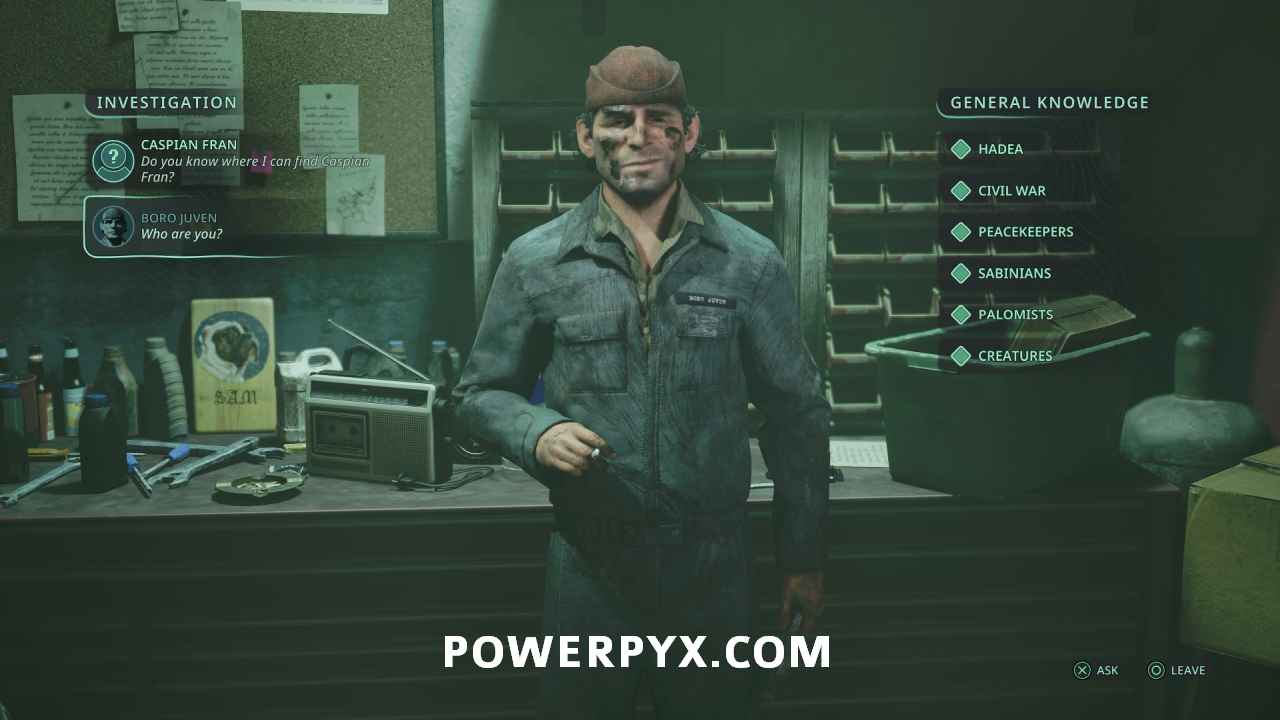 NPC #11: Boro Juven – From the APC follow the path north to a dead end area where there is a garage. Go inside and speak with the man. He’ll give you the Map of Talju which you can use to mind you way around.