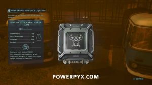 Drone Module: Forward Charge – Elite – Continue west and drop off the ledge toward the two enemies. On the ground to the right you can pick up this Drone Module. This doesn’t count as a unique one toward the trophy/achievement, as it’s an upgraded version of Forward Charge. Make sure to switch it out if you’ve been using the first version.