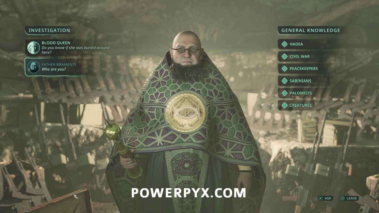 NPC #15: Father Bramante – Unlock the gate and go into the area with the soldiers. Speak with the priest standing in front of them.