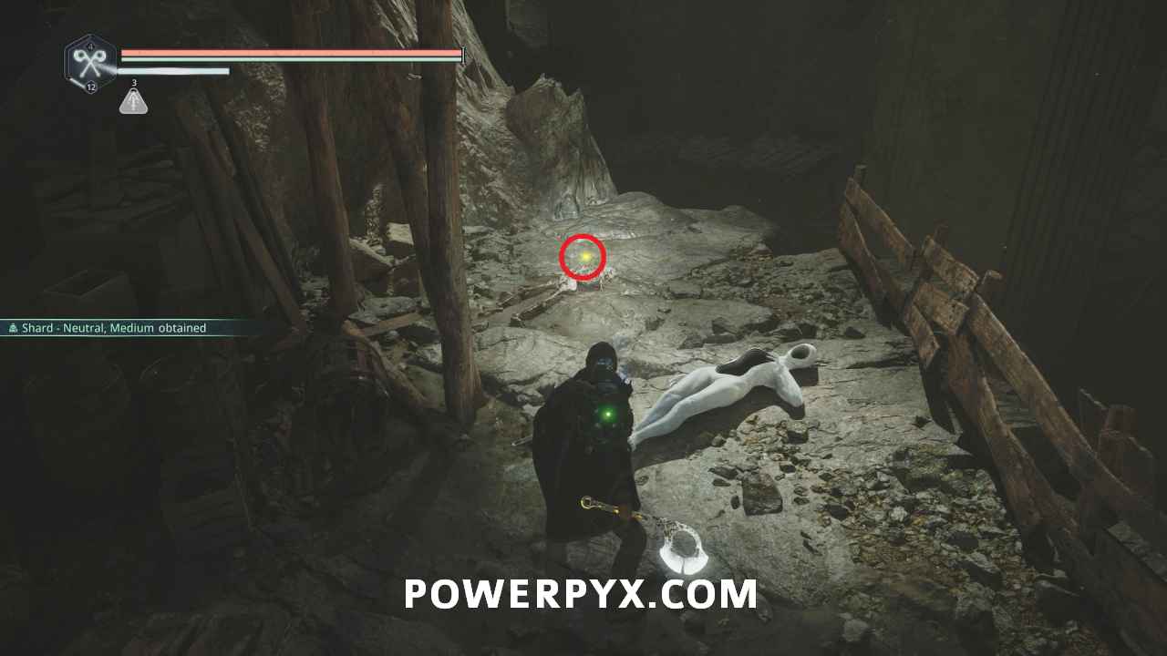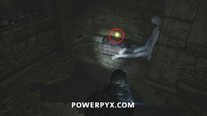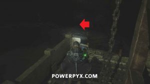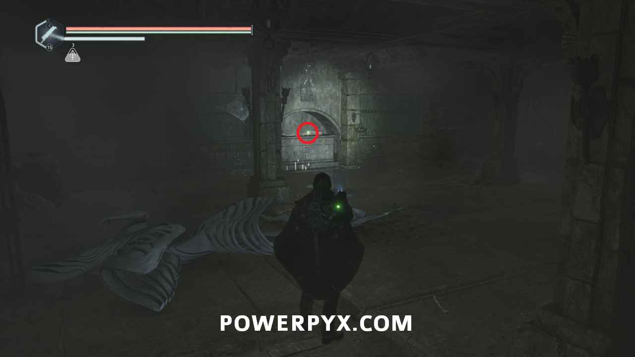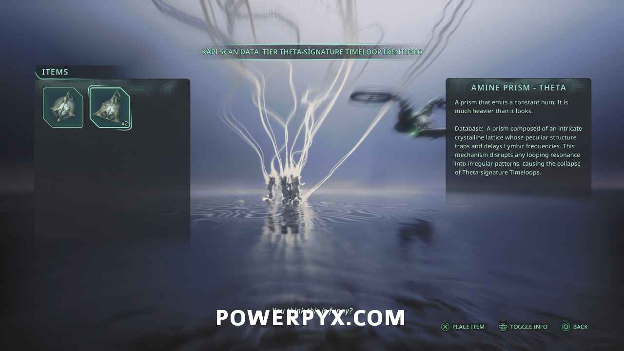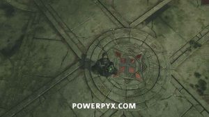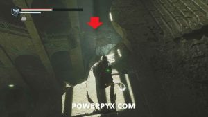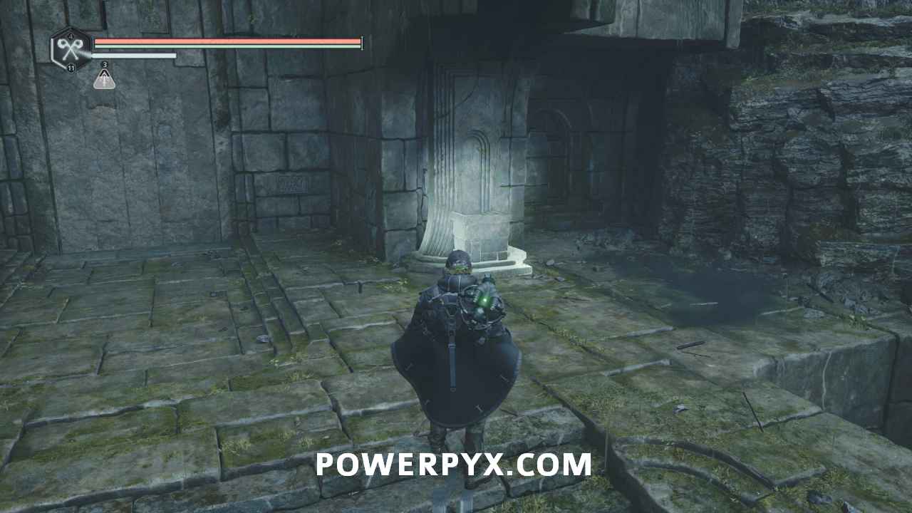 Amine Prism – Theta – Drop off the wall back outside and retrace your path back inside the ruins to the first wooden staircase. This time you need to drop off onto the wall on the northwest side, which will allow you to walk around the edge toward the ranged enemy that is in the corner. Drop into the lower area with the enemy and you can pick this up from the chest nearby.