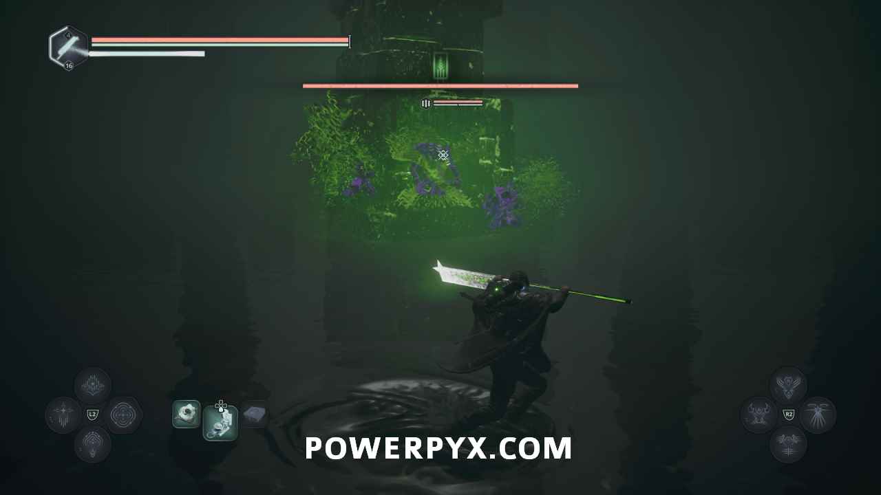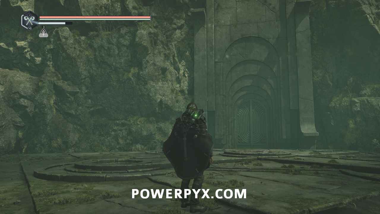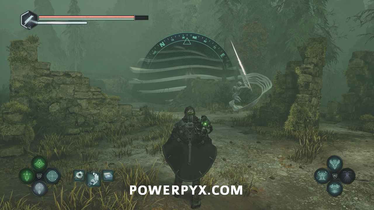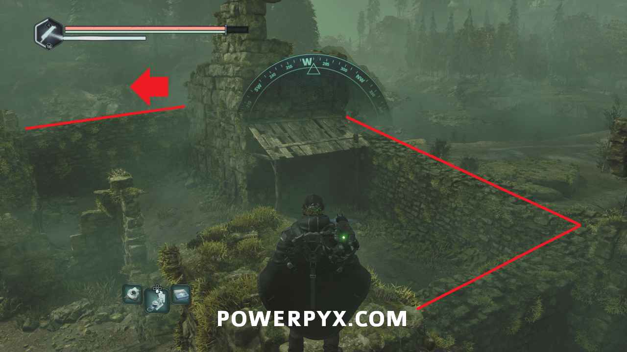 Amine Prism – Theta – Drop off the wall back outside and retrace your path back inside the ruins to the first wooden staircase. This time you need to drop off onto the wall on the northwest side, which will allow you to walk around the edge toward the ranged enemy that is in the corner. Drop into the lower area with the enemy and you can pick this up from the chest nearby.
