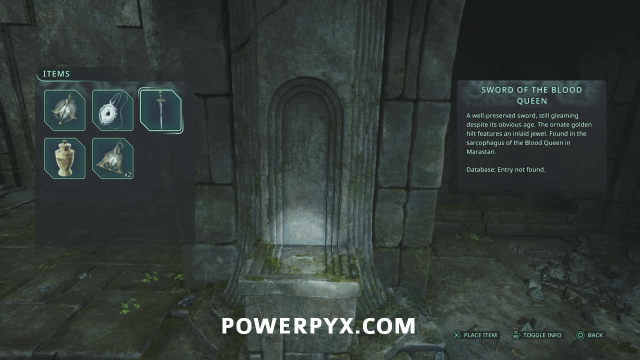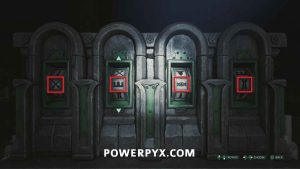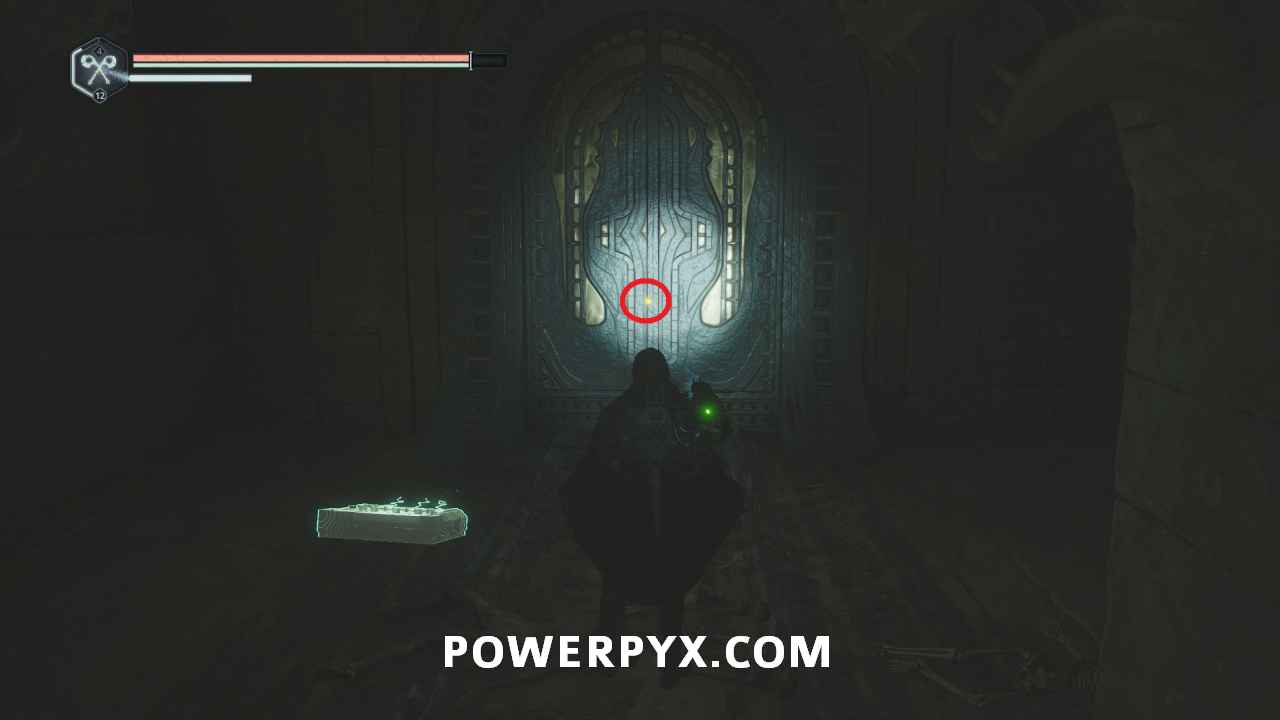 Defeat the enemy that appears, then head into the new area. Defeat all the Hollows inside, then interact with the dials in front of the coffin. Switch them to the order as conveyed in the murals around the room: Sword, Crown, Eye, Tower. Pick up the item that appears to acquire Sword of the Blood Queen and Scroll – Queen’s Eulogy.