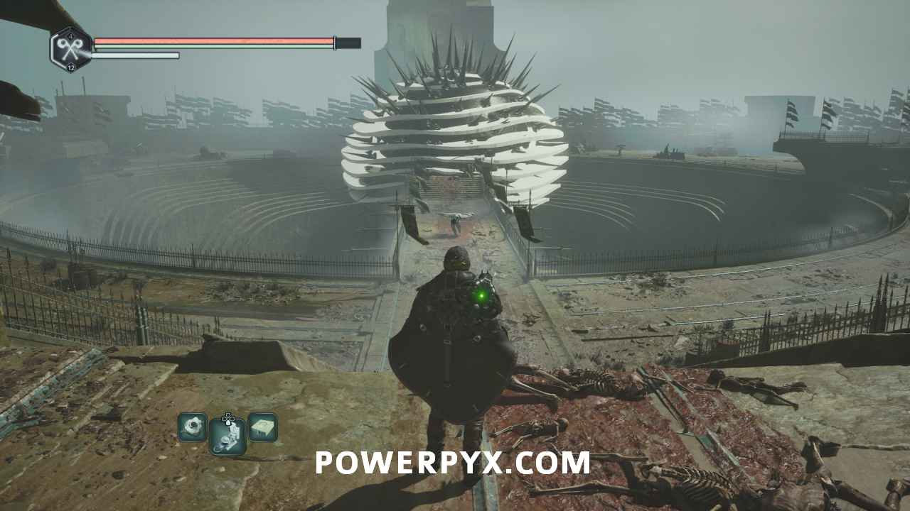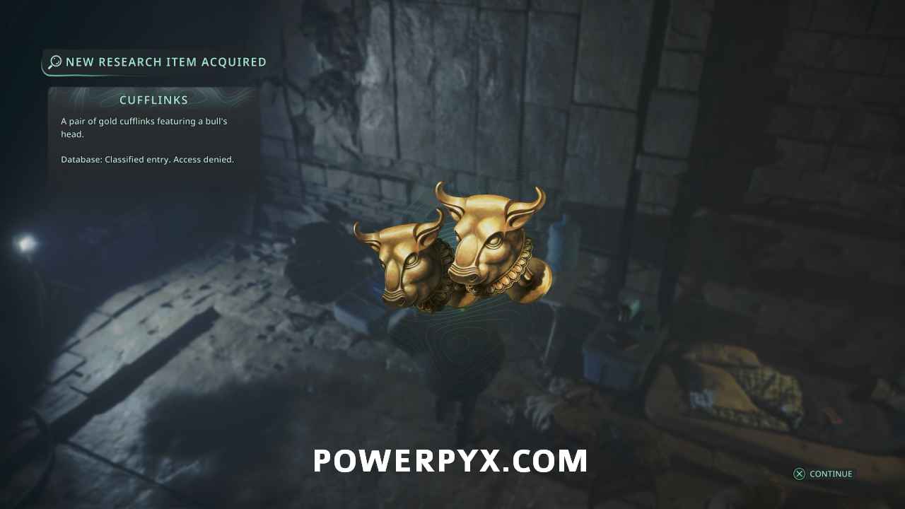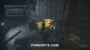 Research Item: Crown of Bones – Behind the Timeloop opposite where you entered is a building you can open doors to go inside (and how you leave the area). Upstairs on the balcony you can pick up this item.