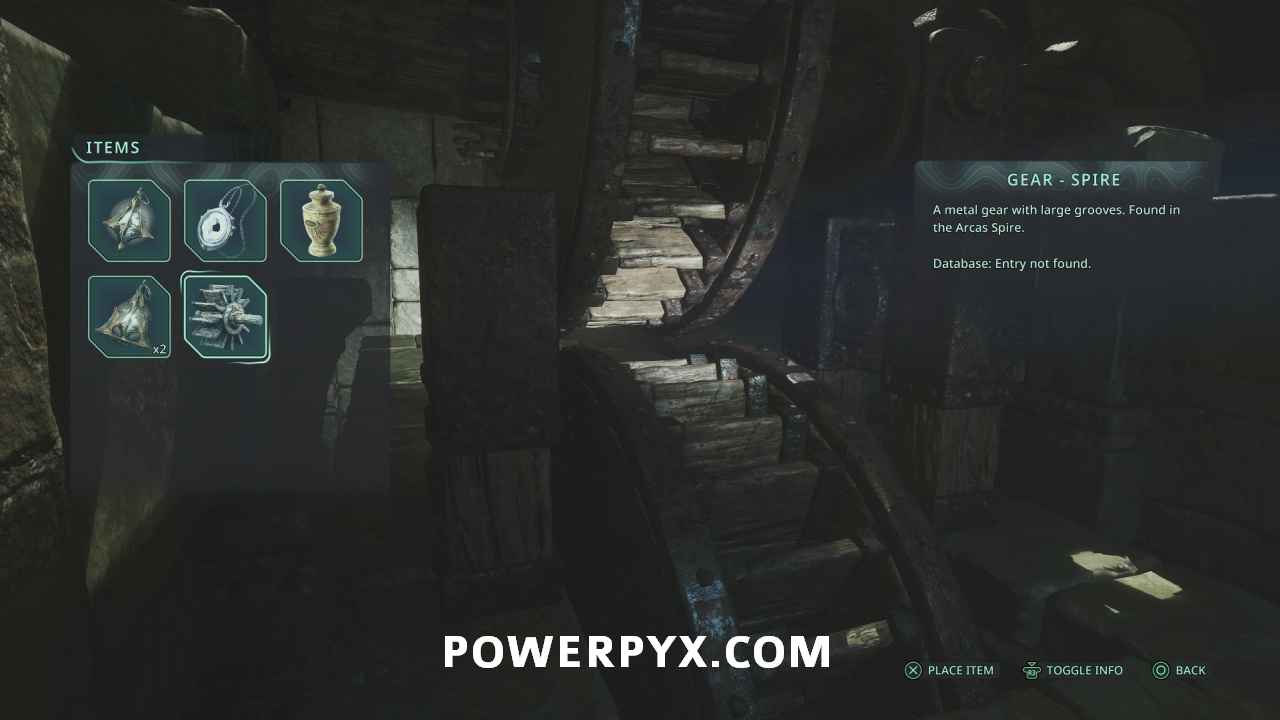 Go back to the elevator and there is a room underneath. Interact with the mechanism and place Gear – Spire to allow the elevator to be used, then ride it up.