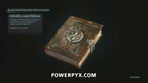 Research Item: Children’s Book – Follow the other path through the tunnel, turning to the right when you reach the lights (the other path is from the gate by the house where you picked up the fuses, but you have to use the key from the other side to come that way). When you reach the spot in the cave with the next enemy look left where there is a side path. By the ledge you can pick up this Research Item, along with Lymbic Rod – Rage, Y and Recording – Caspian’s Stalled Research.
