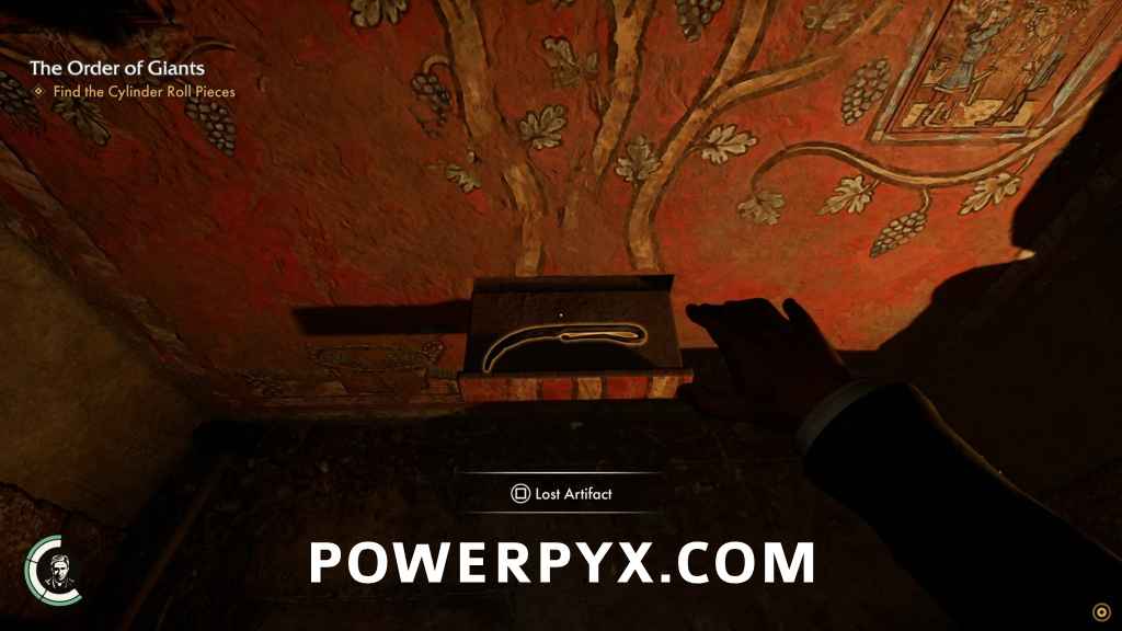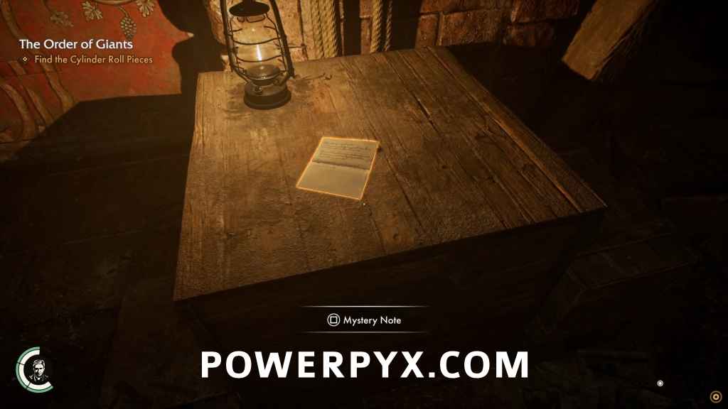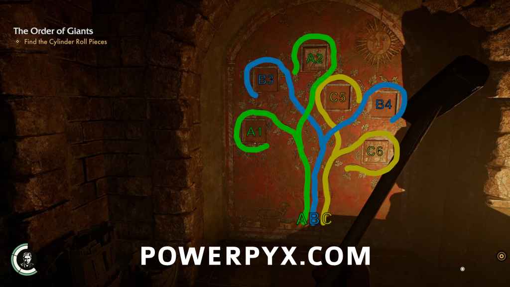 Pick up any of the tiles in this area, or the mystery note to activate this quest. On the west wall, you’ll see a mural with six slots to put tiles, four of which are empty. Right next to it will be a note explaining the artwork and the puzzle it hides. It says that you have to put the tiles in the right order, but importantly, the vine branches are significant when determining what the right order is.