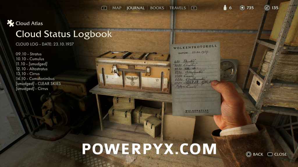 Read the two notes. The Cloud Atlas Page will list a series of dates. 13.10, 9.10, 16.10, 14.10. These dates will correspond to the weather on the Cloud Status Logbook.
