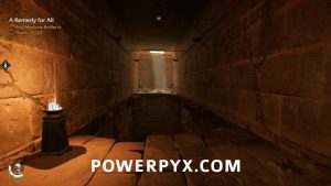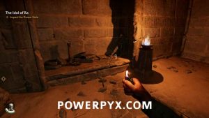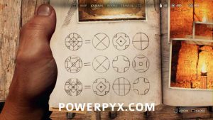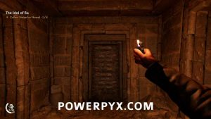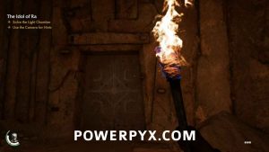Keep heading through the tunnel and up stairs until you reach a large room. Ahead of you, you’ll see a pressure plate to step on. Doing so will open a portal in the ceiling for the sun to shine in. There are stairs to the left and right, both will lead to similar pressure plates. Once all three portals are open, the statue in the east will become illuminated and a panel on its chest will slide down to reveal an Adamic word. Interact with the statue to continue.
