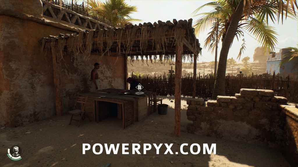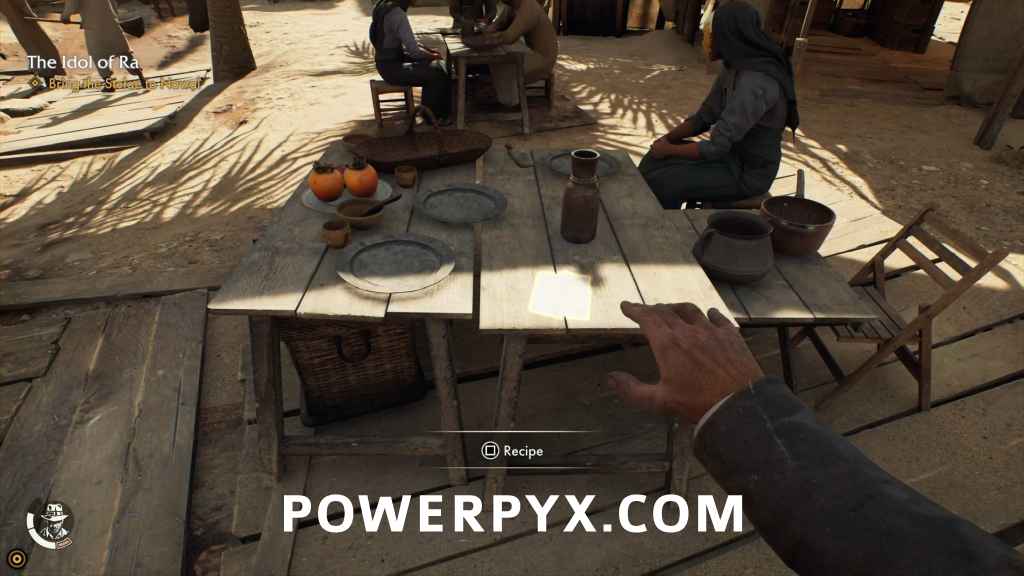 In Gizeh Village, straight north of the fast travel signpost on the other side of the fence is a table under a wood and grass shelter.