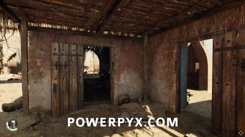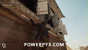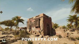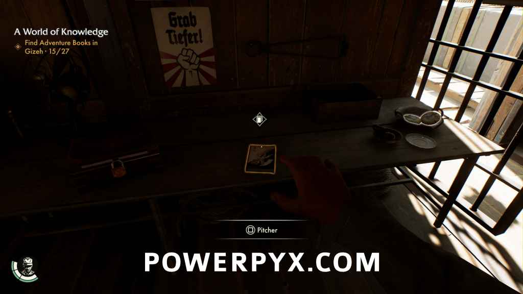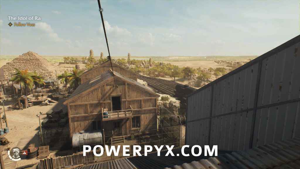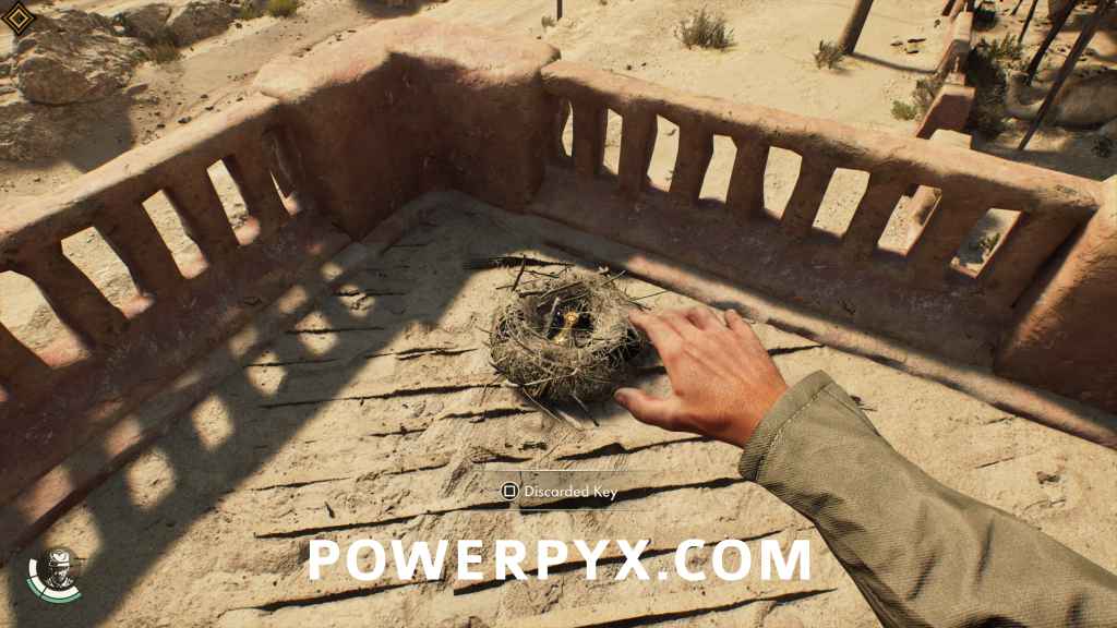 Now there are four left on your map roughly in a square. Next will be the northeast site, and there are some collectibles and items to grab along the way. First head to this small house north of the Sphinx. Inside is a man who seems to be locked inside. Climb up on top of the roof to find the key to the door in a birds nest.